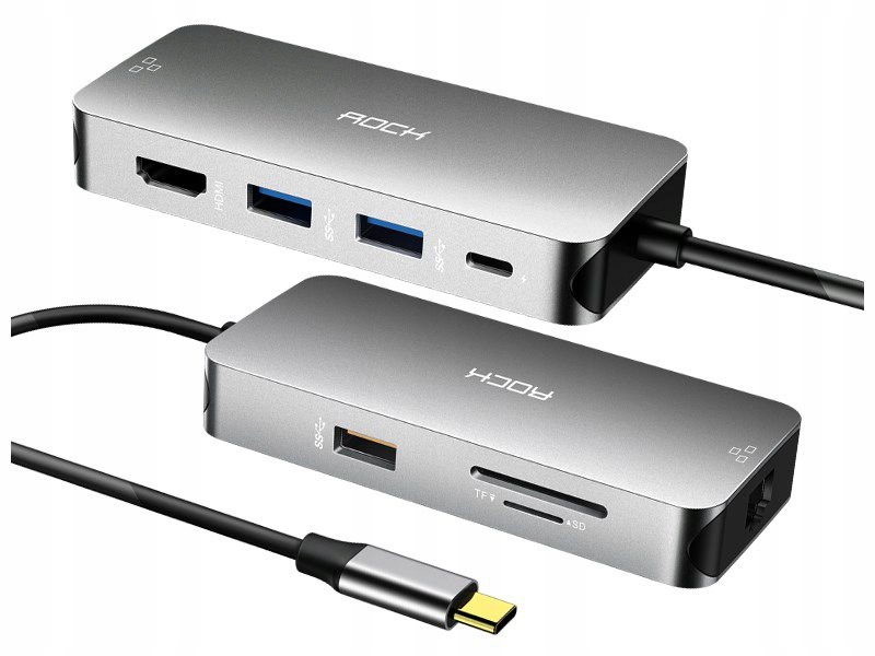 HUB SUB-C 8in1 ROCK - це панель розширення для пристроїв, оснащених портом UBS-C. Дозволяє підключати багато різних пристроїв, що робить його дуже універсальним, корпус виготовлений з алюмінію, що робить всю конструкцію легкою і в той же час дуже міцною. Порт USB-C із підтримкою технології Power Delivery (PD) дозволяє заряджати пристрої Apple, оснащені портом USB-C. Адаптер оснащений трьома портами USB 3.0, одним портом HDMI з підтримкою 4K, пристроєм для читання карток SD і TF і портом RJ45, що працює за технологією Gigabit Ethernet.