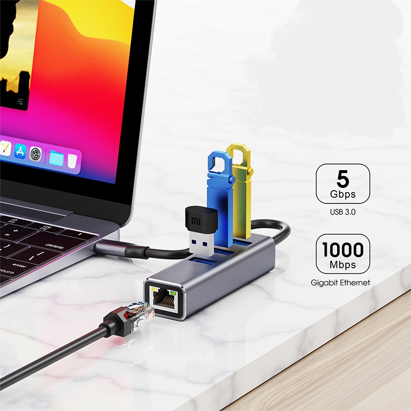 ✅ Хаб підтримує швидкість передачі даних з носіїв даних USB 3.0 до 5 Гбіт/с та з Інтернету до 1000 Мбіт/с