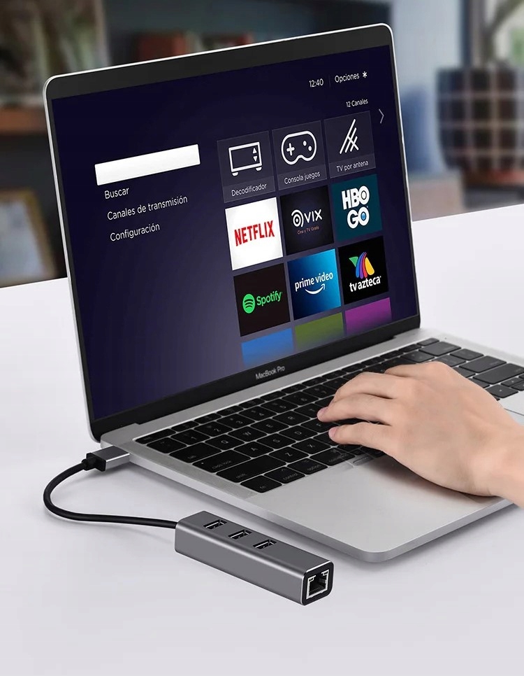 - Концентратор: 3 x USB 3.0 + мережевий адаптер RJ45, вхід USB C, 4 в 1.