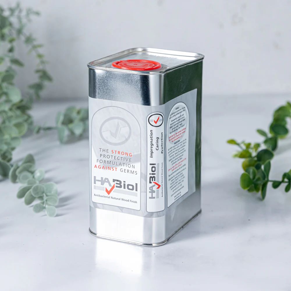 Хабіол пройшов тестування відповідно до DIN-en 71-3, придатних для дерев’яних іграшок для дітей і є антибактеріальним згідно з 31LFGB, завдяки якому жодна бактерія не потрапляє в їжу на зустрічі кухні. кухонна стільниця, піклуючись про її стабільність та бездоганний вигляд.