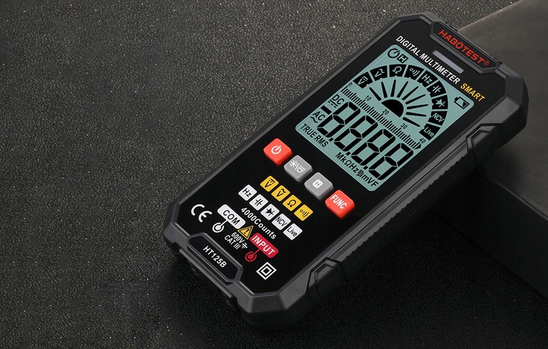 HT125B -це розумний і довговічний Habotest Multim -. Він характеризується високою точністю вимірювань, а це означає, що ви також можете використовувати його зовні. Оснащений великим дисплеєм та силіконовими кнопками - це просто та зручно використовувати. Компактний і легкий - він також має світлодіодний ліхтарик, який також дозволяє працювати в темних місцях. Для його джерела живлення вам потрібні дві акумулятори AAA 1,5 В. Однак вони не були включені в набір і їх слід придбати окремо. За допомогою його допомоги ви вимірюєте напругу, опір, ємність тощо