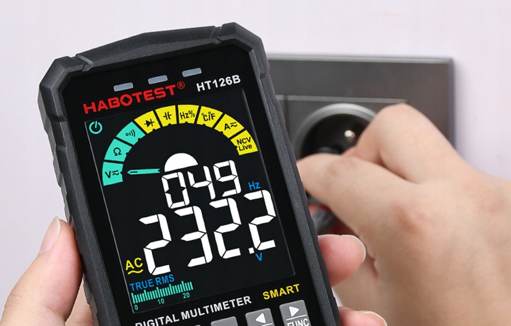 Пристрій Habotest виділяється з неймовірною точністю. . Ви також можете перевірити активність кабелю. За допомогою його допомоги ви перевірите діоди, перевірте безперервність та справжнє значення RMS. Це також дозволяє виявлення напруги неконтактів (NCV). Вхідний порт гнізда освітлюється зеленим.