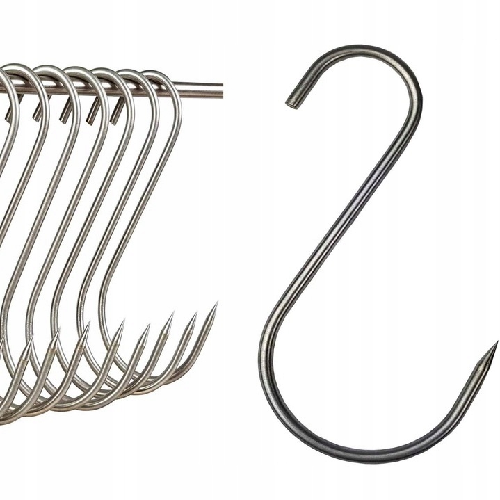 - Нанизування м'яса на коптильні гачки спрощує приготування домашньої нарізки або риби в коптильнях. Гачки для м’яса мають гострі кінці, що дозволяє легко встромити їх у м’ясо та підвісити в коптильні.