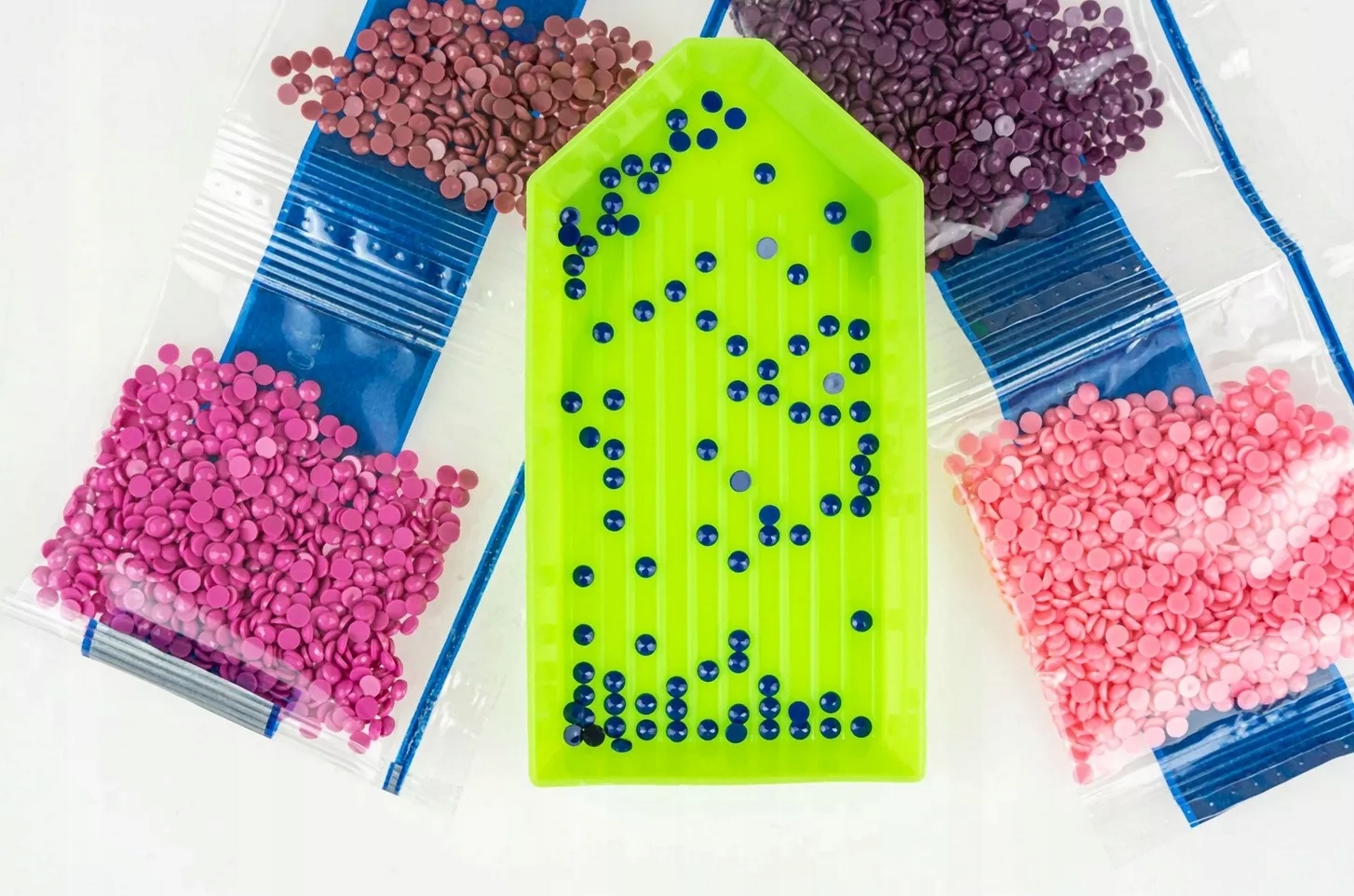 3. Виберіть діаманти, які ви будете наклеювати. Знайдіть відповідні символи та цифри на відкритій частині полотна. Насипте порцію кристалів обраного кольору в пластиковий контейнер.