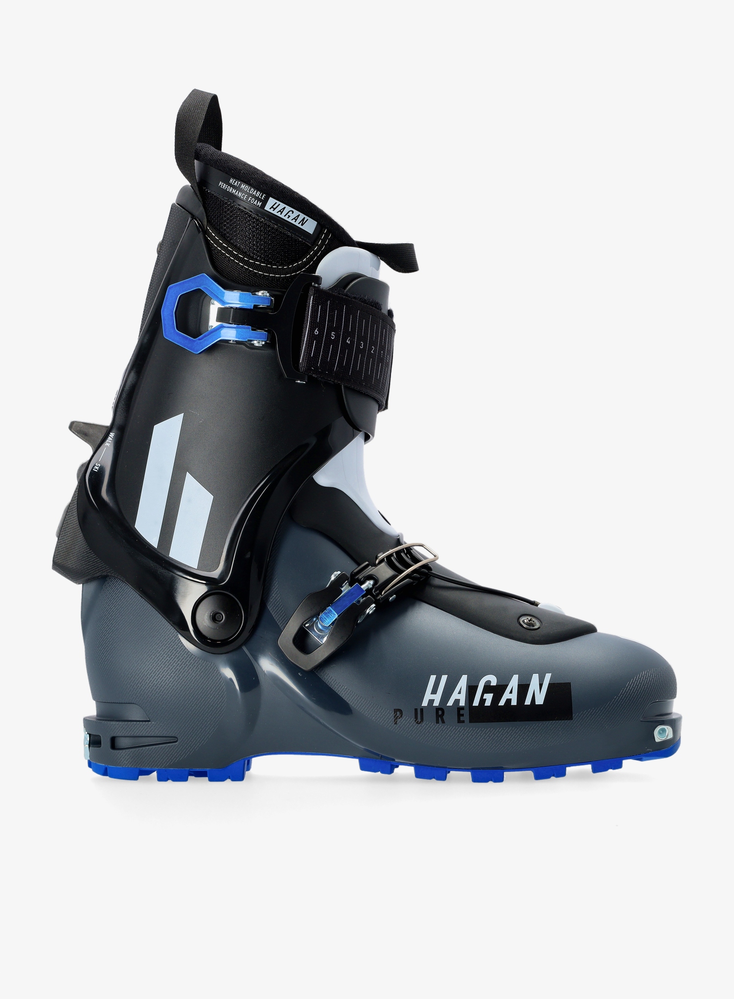 Гірськолижні черевики Hagan Pure з колекції 2023 рокуце модель, яка відповідає всім вимогам до гірськолижних черевиків. Представлена модель пропонує діапазон руху 60 градусів, що перетворюється на природний комфорт під час підйому, забезпечуючи при цьому відмінне положення при спуску завдяки нахилу вперед на 16° у режимі спуску. Точне прилягання до стопи забезпечується термоформованим внутрішнім черевиком і оболонкою, яка пропонує можливість вибіркового розширення в передній частині стопи.
