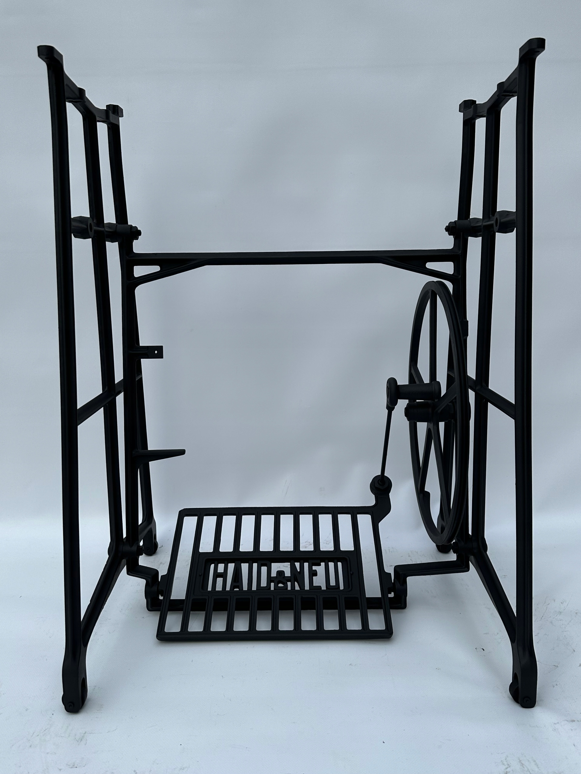 Предмет продажу стара чавунна основа від швейної машини HAID & NEU. Дуже гарний візерунок. Посередині напис з логотипом компанії. У нього всі 4 колеса внизу. Додатковою перевагою є металевий елемент, який з’єднує колесо з педаллю приводу, тому ми можемо бути впевнені, що його не з’їдять дровоєди, що можливо в базах з дерев’яним елементом.