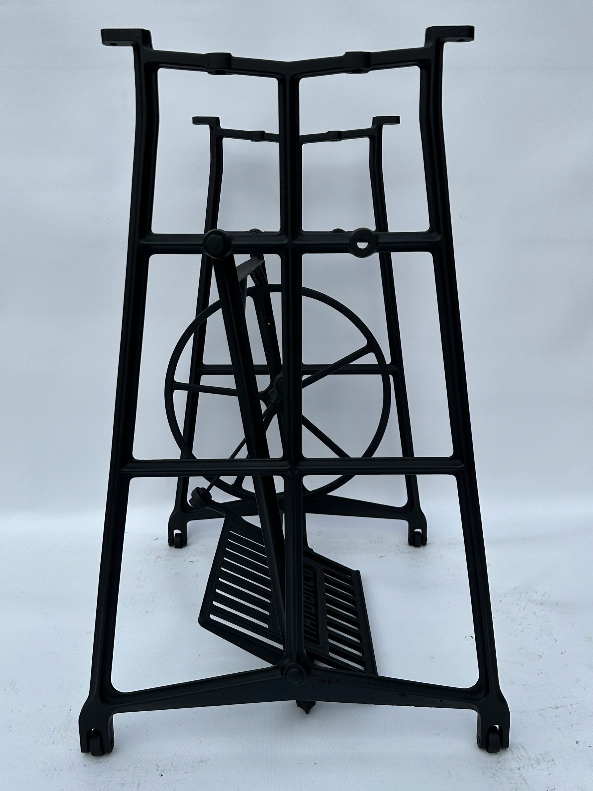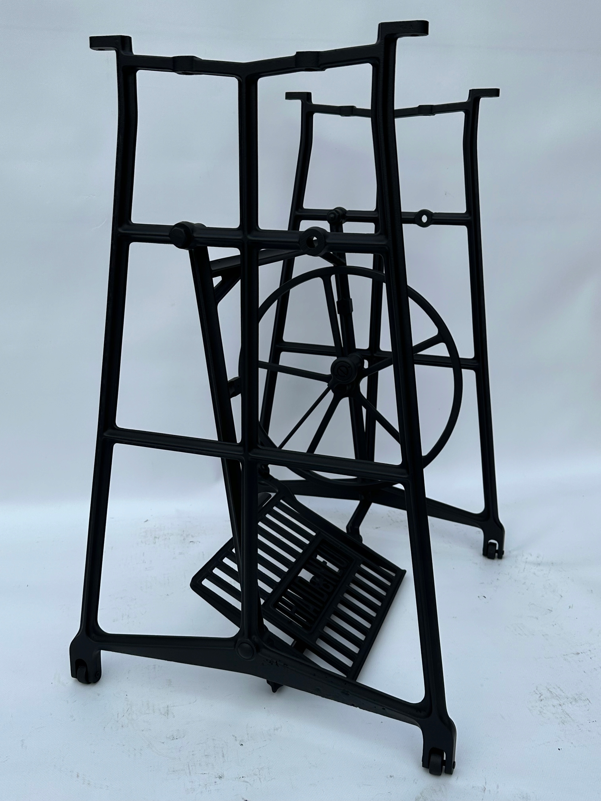 У верхній частині є 4 оригінальних отвори, до яких можна прикріпити стільницю. Це видно на останньому фото. Стан - після професійного ремонту. Піскоструменева і пофарбована в чорний колір, як на фото - готова до установки. Після додавання верху він може служити, наприклад, комп’ютерним столом. Якщо ви шукаєте щось оригінальне, цей аукціон саме для вас.