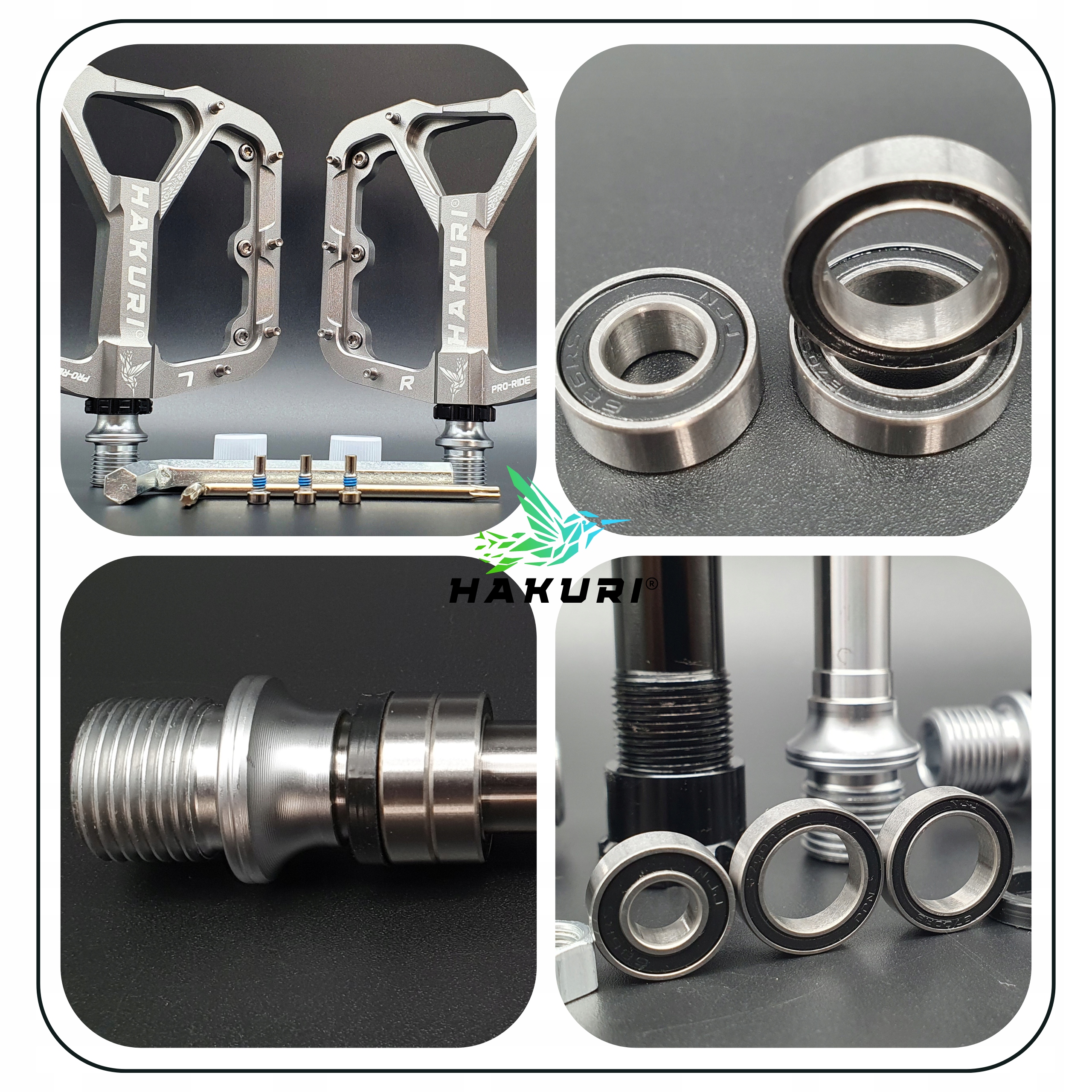 У педалях HAKURI PRO-RIDE DYNAMICS підшипники є важливим елементом і безпосередньо впливають на термін служби педалей. Педалі PRO-RIDE мають три добре герметичні картриджні підшипники, які дуже стійкі до погодних умов і не потребують обслуговування.