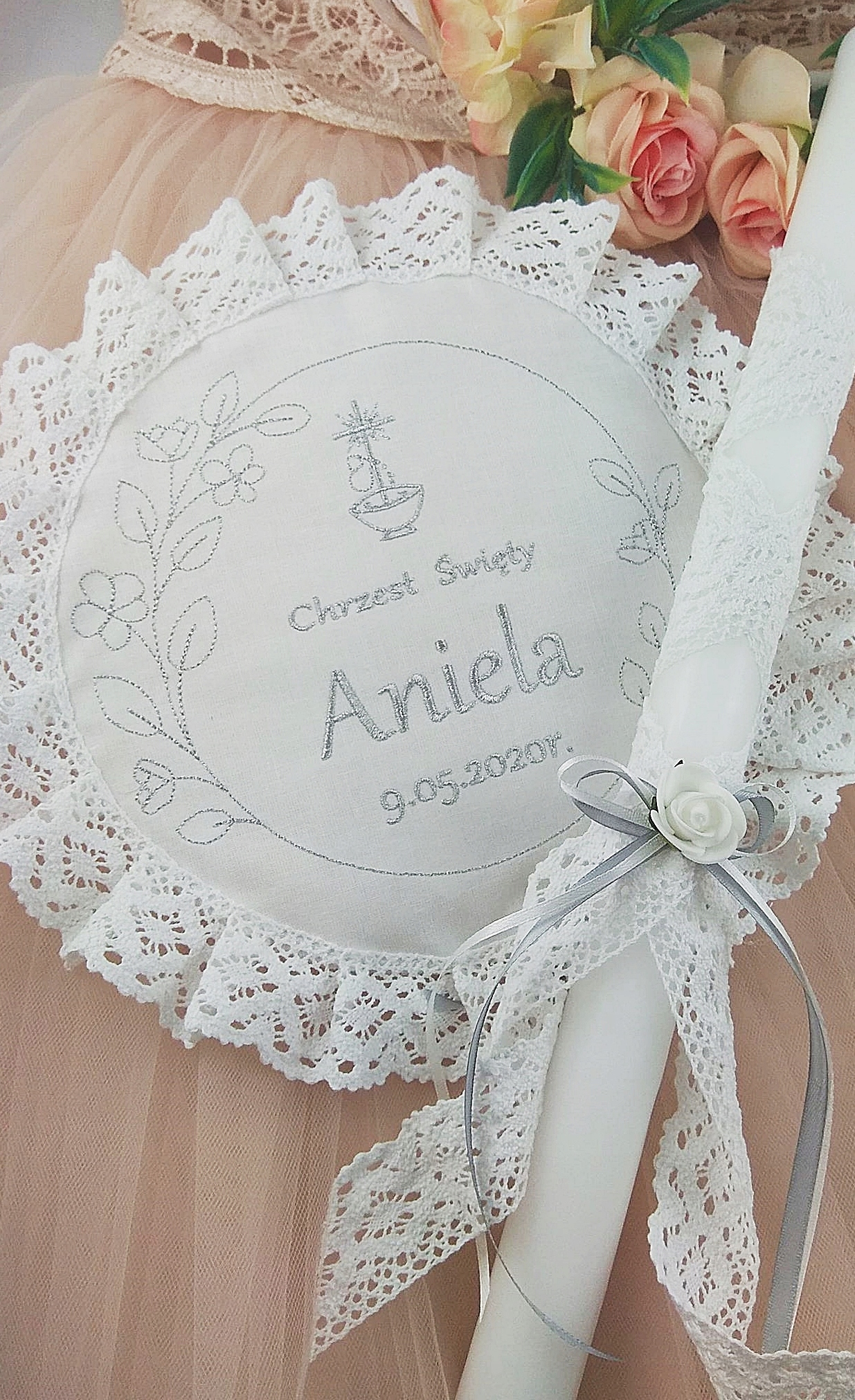 - халата круглої формизробленого з високоякісних матеріалів, з увагою до кожної деталі. Виготовляємо її з білосніжного бавовняного полотна, обробленого білим бавовняним мереживом. Свічка повністю індивідуально персоналізована відповідно до ваших уподобань.