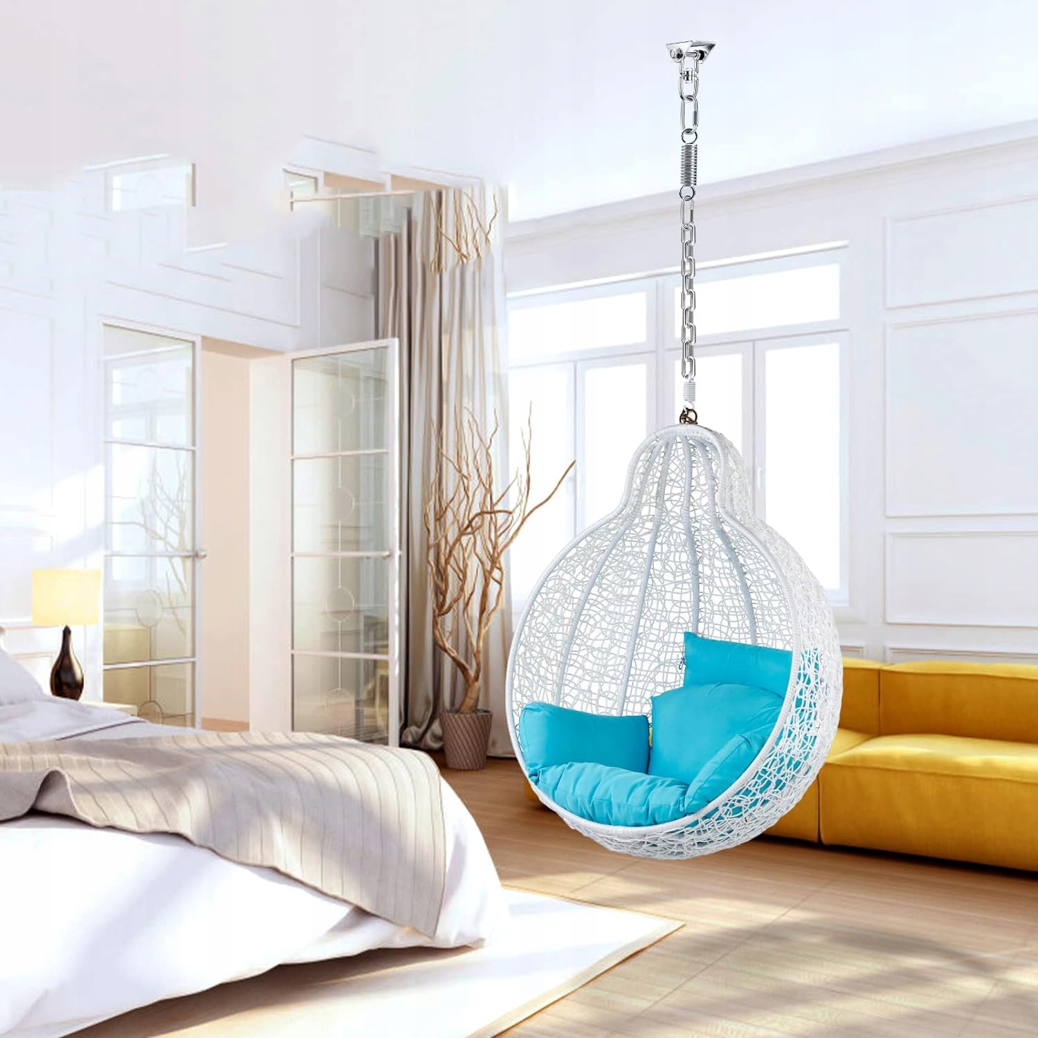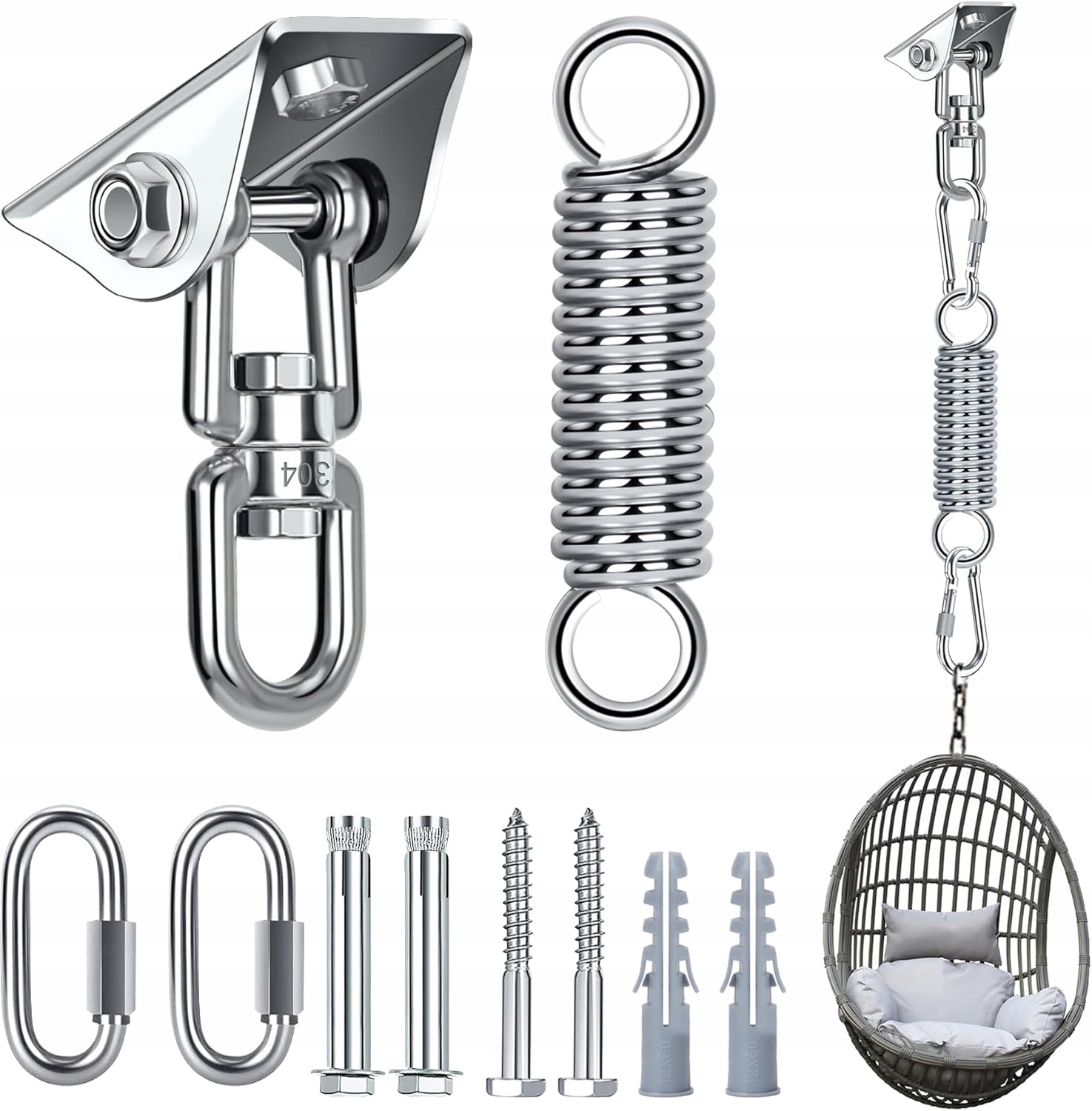 висить на підвісні стільці, виготовлені з належної та надійної корозій, придатні для встановлення всередині та зовні, висіть більш стійкі, безпеку, оцінену на 450 кг, підходячи для дітей і дорослих. Напруги з гачками, виготовленими з високоякісної оцинкованої пружинної сталі, з більшою твердістю та довговічністю.