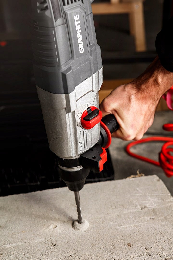 SDS+ 800 Вт, 2,8J Hammer, 58G538 валізу від Graphite - спеціалізований інструмент SDS+ з 800 Вт, з 800 Вт, з функціями свердління, свердління з Пневматичний удар, пиття та здатність керувати кроком кута зубила для точного насоса. Це дозволяє виготовляти отвори до 26 мм у бетоні та цеглі, 13 мм у сталі та 30 мм в дереві. Інструмент має функції зміни напрямку обертання шпинделя, поступового регулювання швидкості та блокування перемикача на безперервну роботу. Під час буріння молоток досягає до 1350 обертів на хвилину, а після переходу на удар до 5500 ударів в хвилину. Енергія ходу в інструменті становить 2,8 J. Зручна ручка Основний інструмент покритий кришкою, що не має слизу, тому він добре в руці. Набір включає: додаткову свердло, свердловину, адаптер для ручки та транспортної валізи. Пристрій оснащений гнучким і міцним шнуром живлення в 3 м довгим гумовим покриттям, також присвяченим професійним та промисловим додаткам, як всередині, так і на відкритому повітрі. Дотримання європейських стандартів забезпечується сертифікат СЕ.