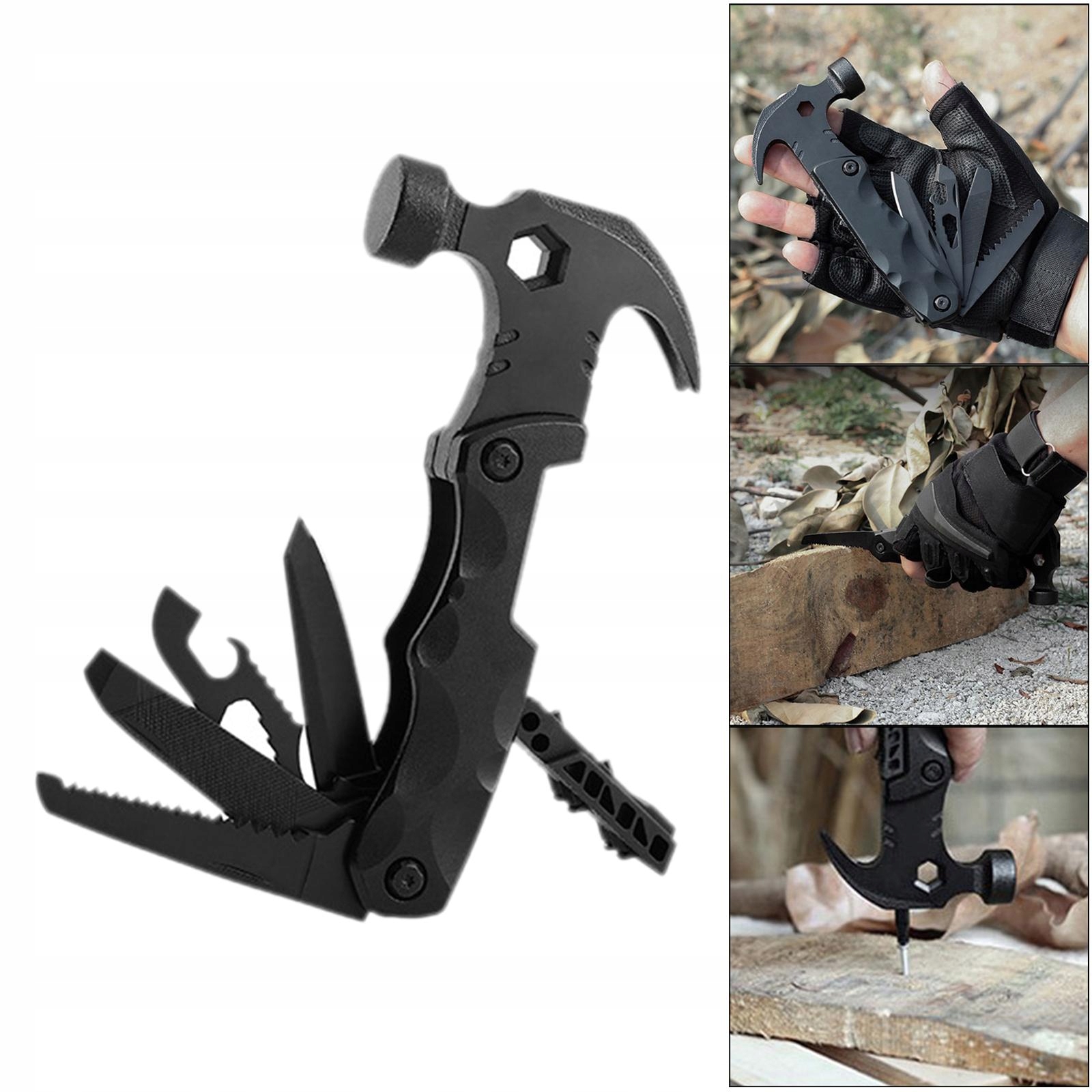 Інструменти «Все в одному»: 9 різних інструментів, зокрема молоток, шестигранний ключ, цвяховий кіготь, відкривачка для пляшок, пилка для нігтів, лезо, ящик для зберігання викрутки, пилка лезо, отвір для кріплення наконечника Цей багатофункціональний молоток дуже зручний завдяки неслизькій ручці для кемпінгу.