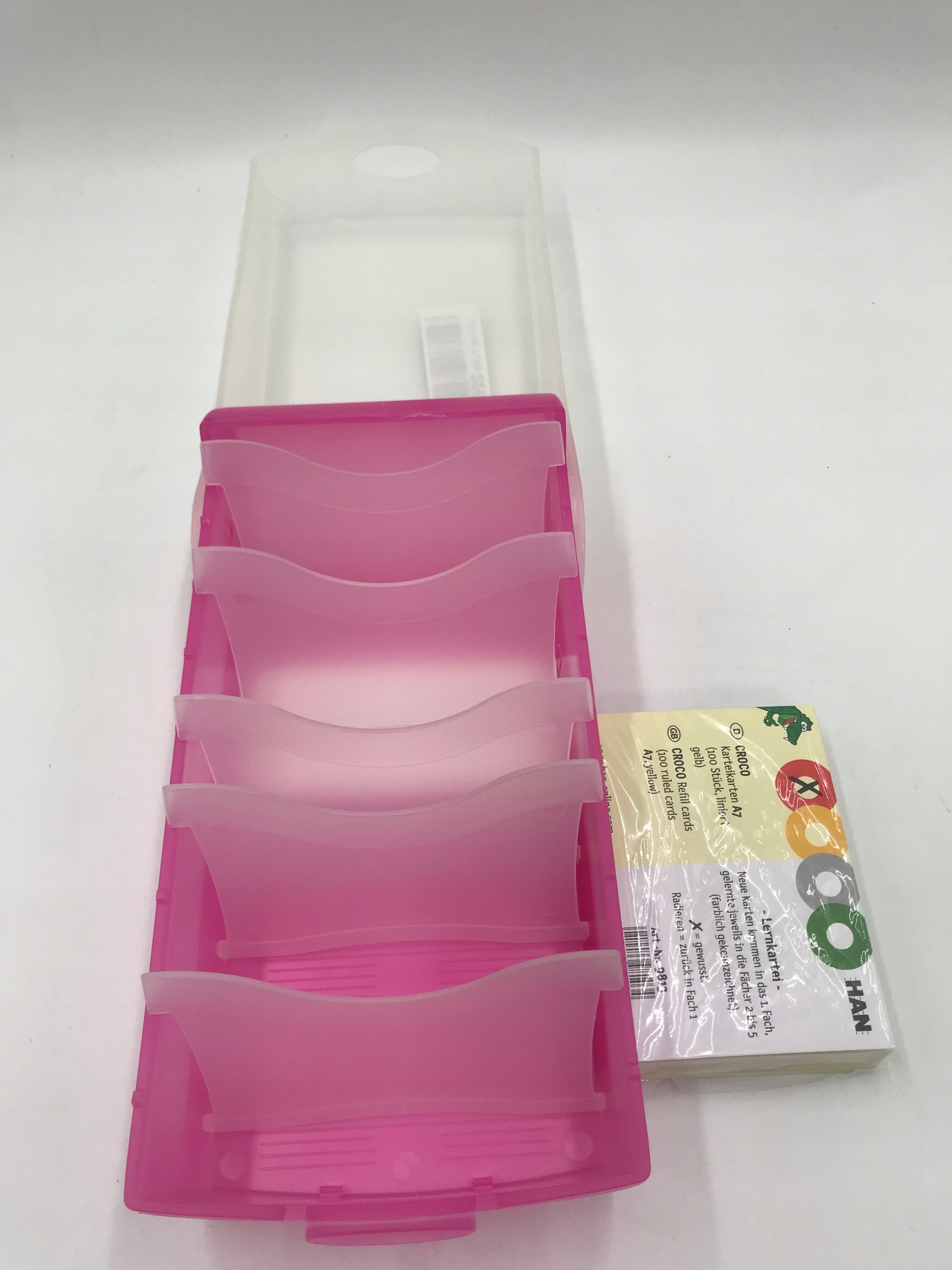 CROCO — ідеальна коробка для карток — англійською чи англійською в початковій школі, французькою чи латинською в початковій школі — підходить для вивчення будь-якої мови, вивчення іноземних мов, а не лише для учнів із «методом 5 кишеньок» " навчання": Завдяки регулярним інтервалам вивчення нових словникових слів і повторення старих, що дає мотивуючий навчальний ефект, файл має місткість 900 аркушів паперу у форматі DIN A7, які можна розділити на 5 областей - ідеально підходить для базової скарб. Всього 100 карток із лініями, Ергономічний дизайн, практичний у використанні: під час відкриття стійка кришка зникає під коробкою, у закритому стані опори замикаються. Комплект поставки: 1 x навчальна коробка HAN 997-663 CROCO. У набір входять 100 лінованих карток DIN A7 (арт. № 9813), 5 змінних опорних пластин і поле для маркування. Оригінальний продукт HAN. Корисна модель. Зовнішні розміри (ширина x глибина x висота): 121 x 246 x 85 мм. Колір: напівпрозорий рожевий