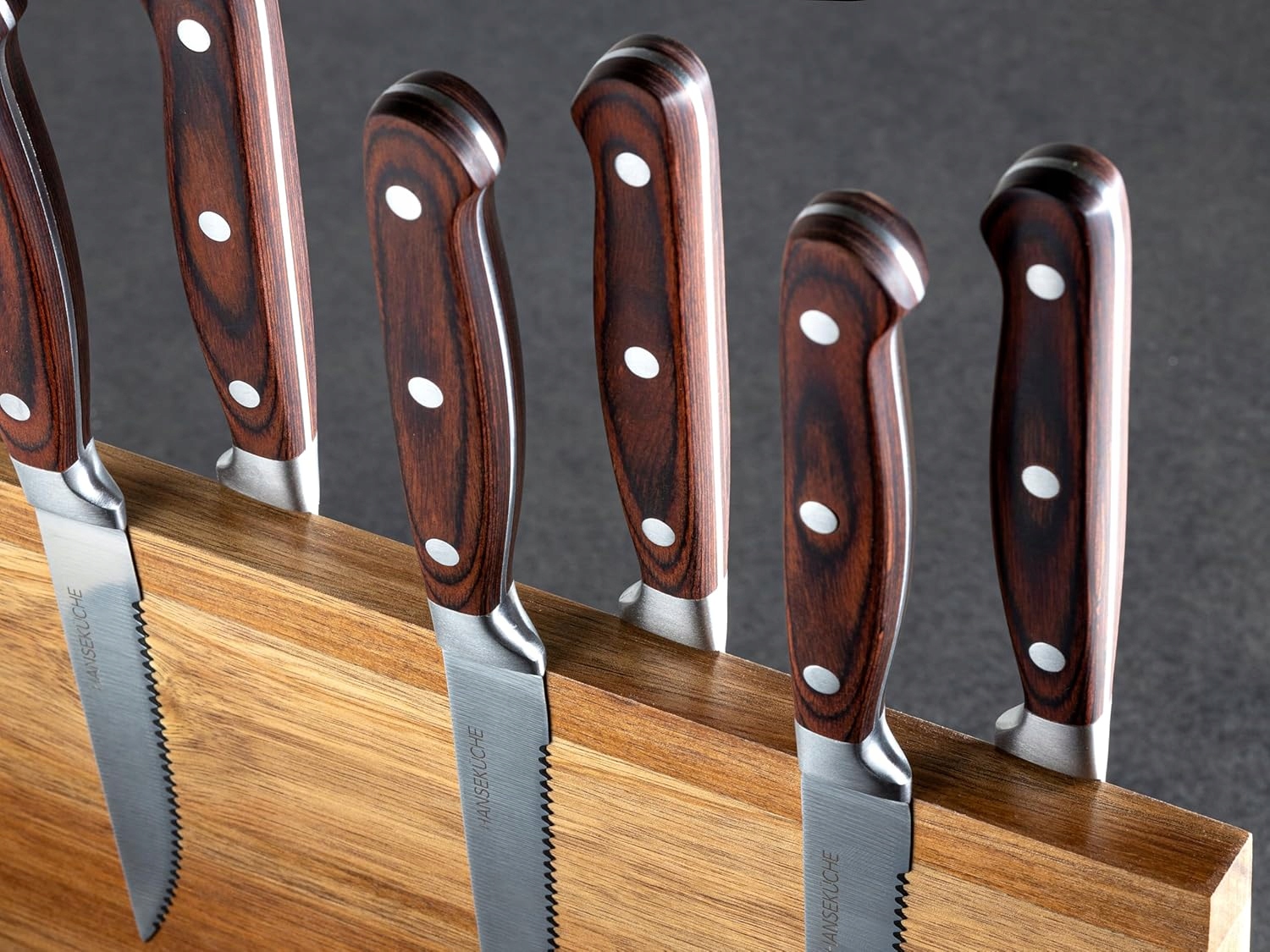 Ножовий блок Hanseküche виготовлено з матеріалів найвищої якості. Поєднання елегантного дерева акації з основою з нержавіючої сталі створює унікальний елемент кухонного обладнання. Вбудований магніт дозволяє легко зберігати кухонні ножі під рукою.