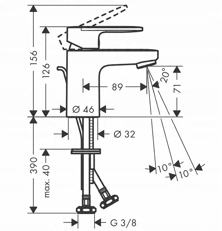 - Діапазон від стіни: 38 см (до центру душової лійки)
