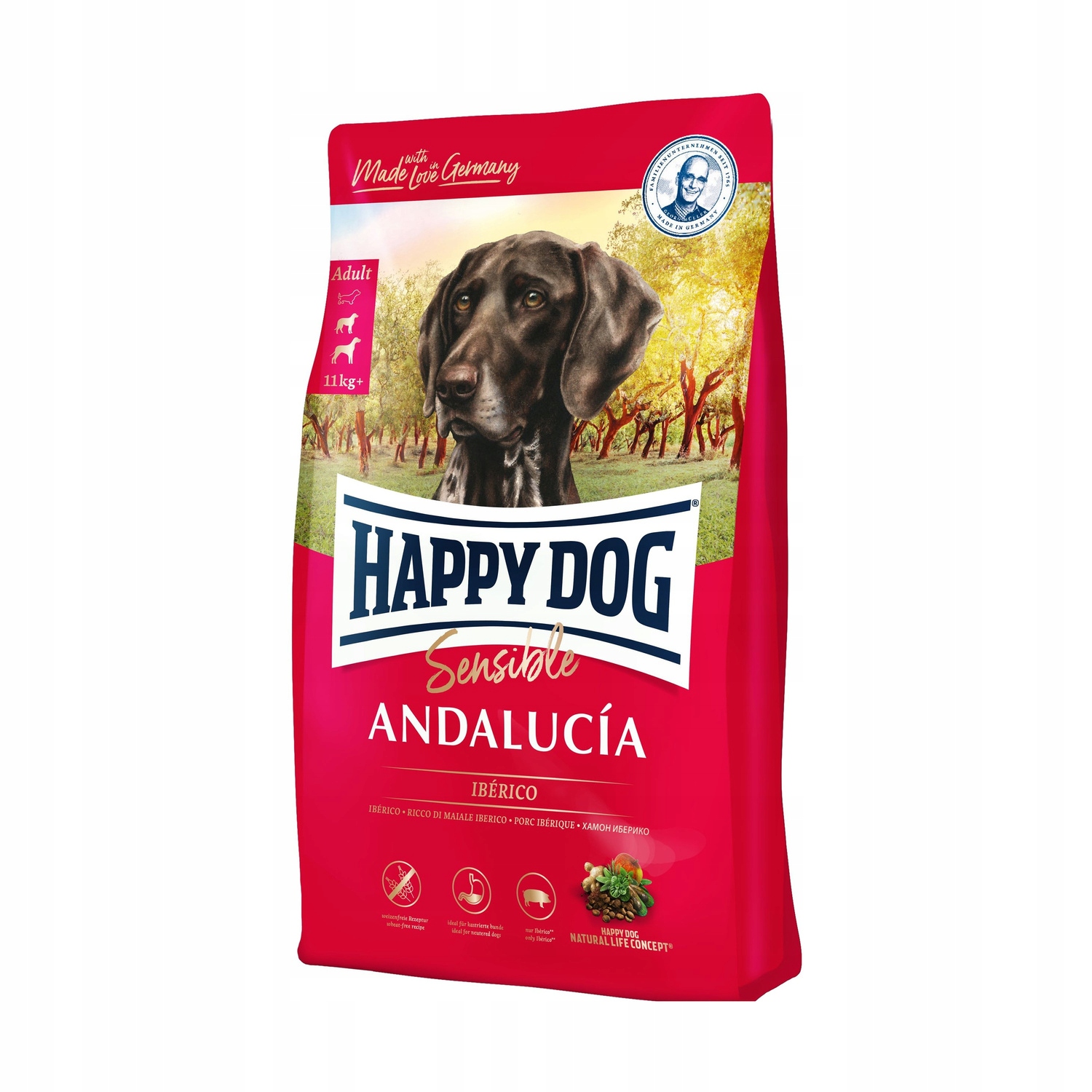 Happy Dog Andalucía ідеально підходить для всіх вимогливих дорослих гурманів від 11 кг, які шукають різноманітності або дуже вибагливі.