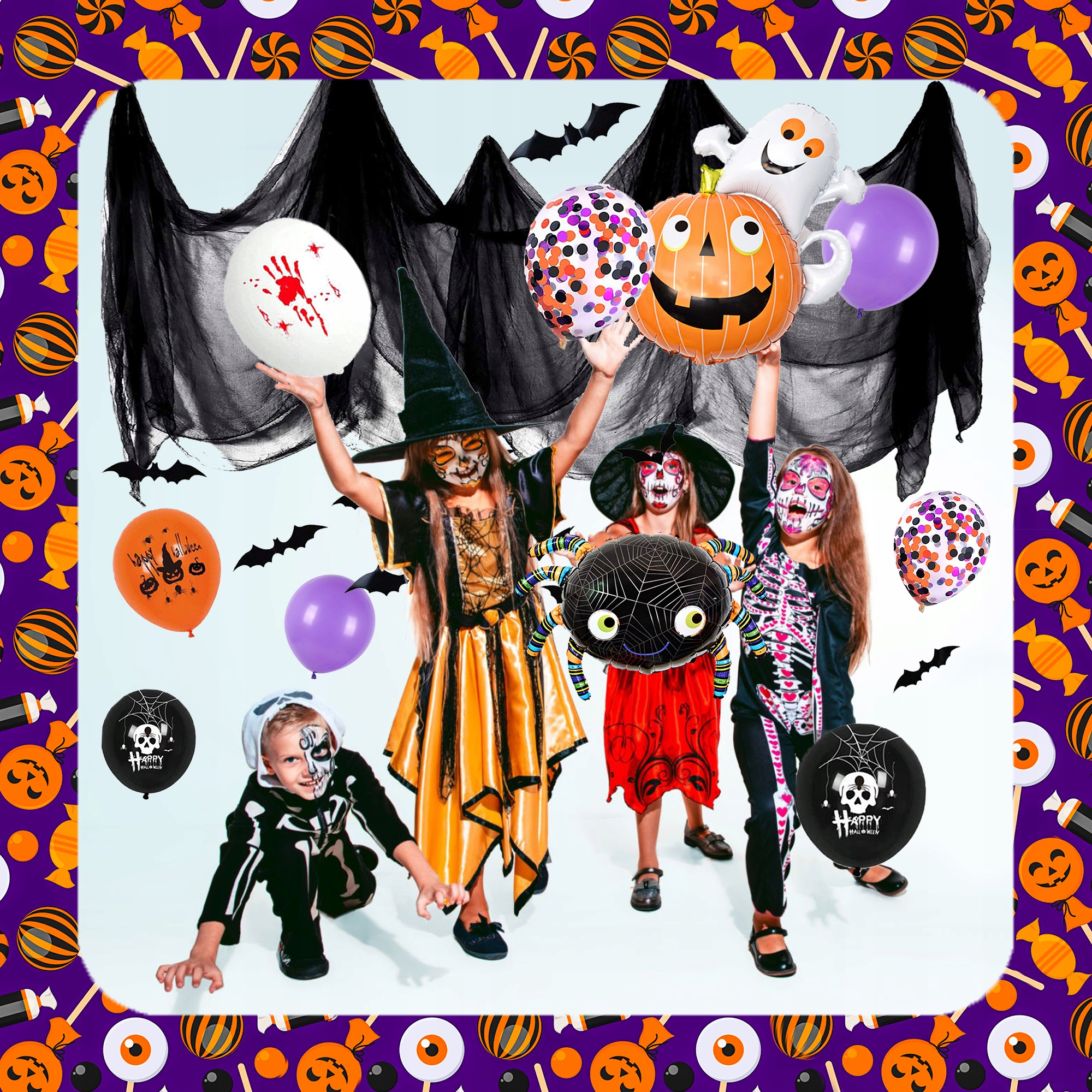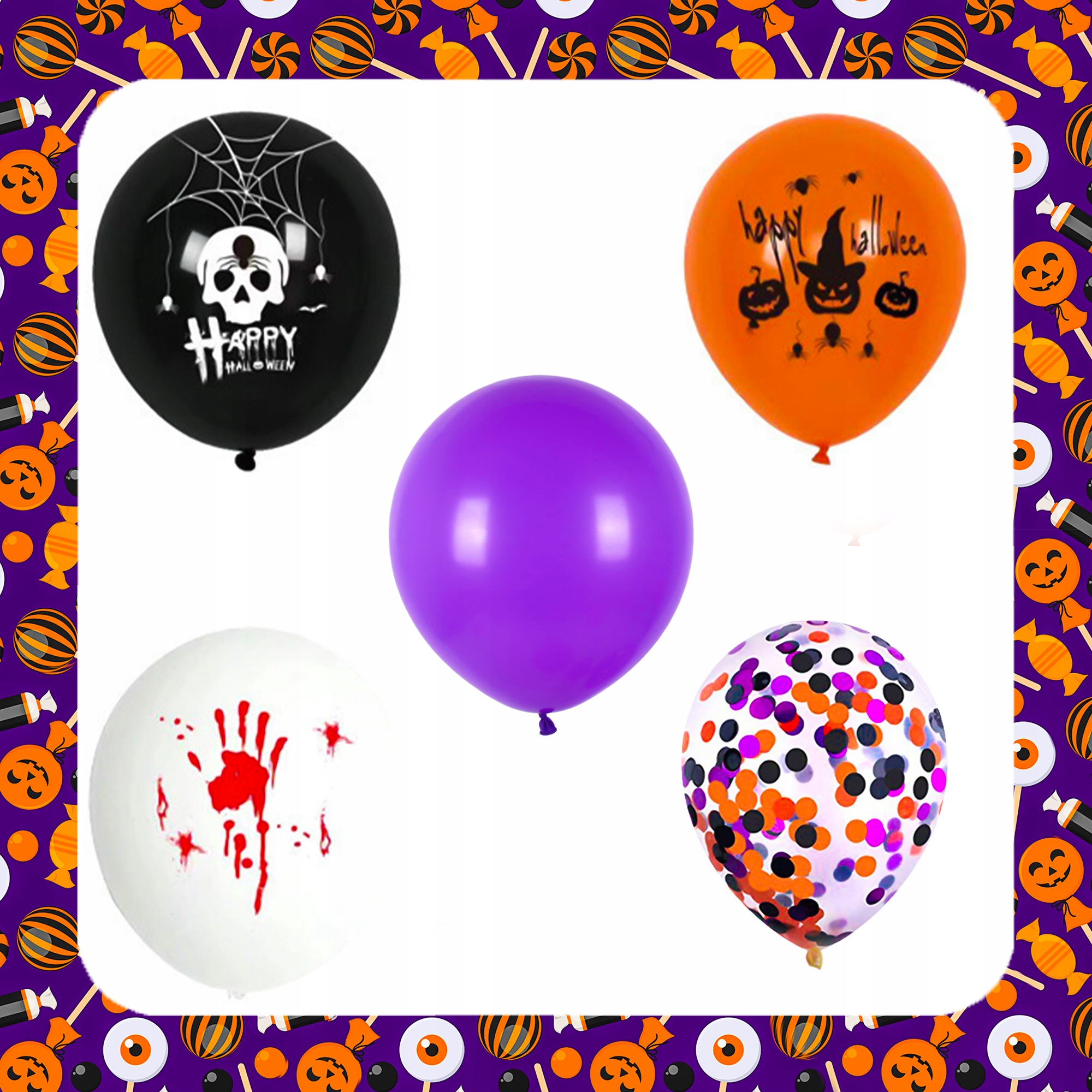 - Повітряні кулі різних кольорів і форм: 26 повітряних куль у класичних кольорах Хеллоуїна (білий, фіолетовий, чорний, бежевий, помаранчевий), у тому числі фольговані повітряні кулі у формі гарбуза, павука та гарбуза з привидом.