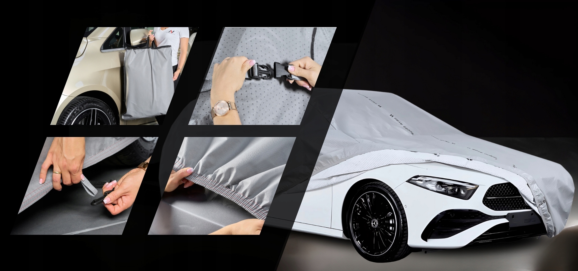 Внутрішній шар у білому, безпосередньо примикаючи до корпусу автомобіля транспортного засобу, є делікатним поліпропіленом, який захищає лакове покриття від подряпин.