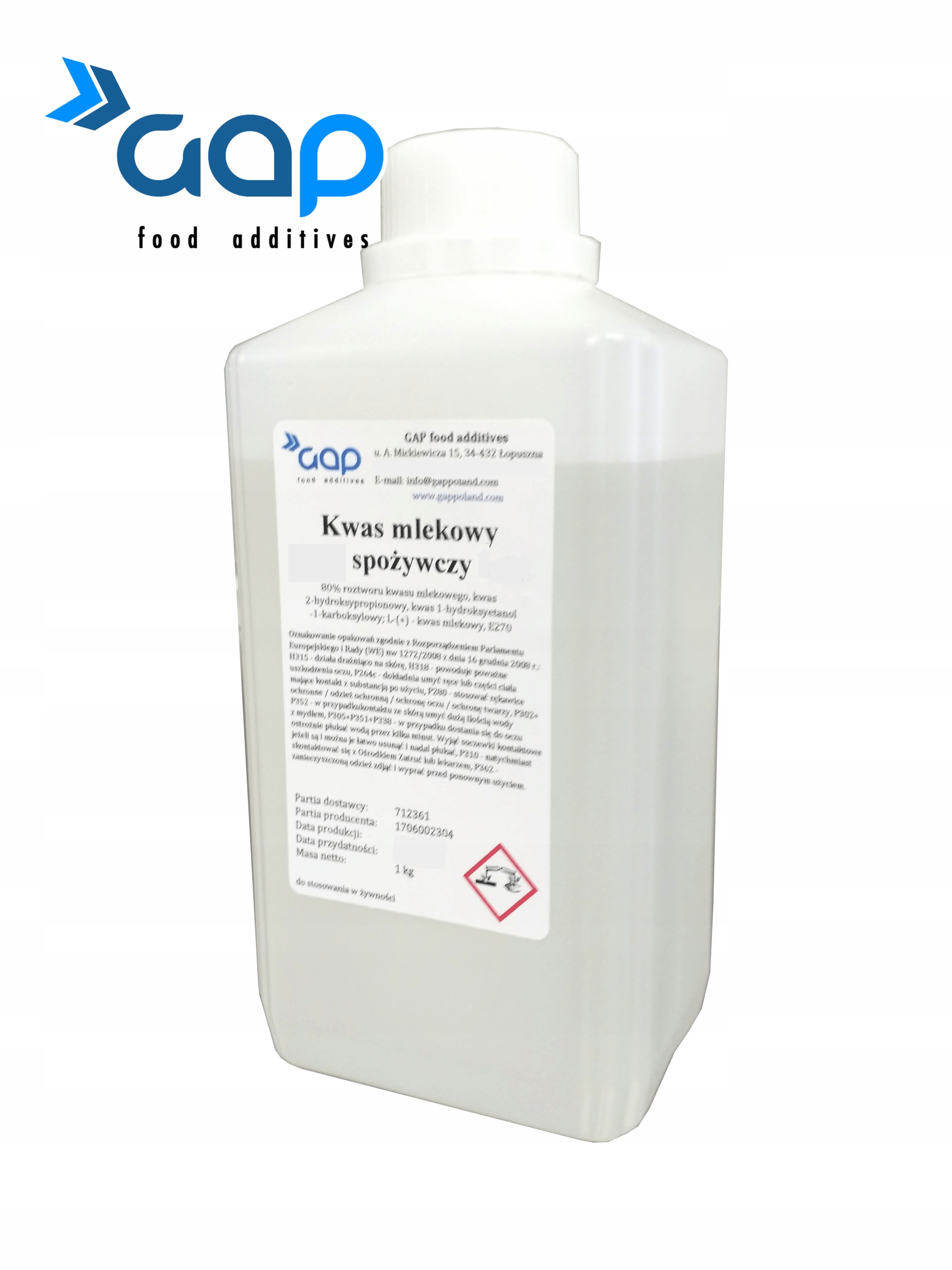 Молочна кислота харчова являє собою 80% розчин молочної кислоти, позначений як E270. Молочна кислота - природна речовина, яка відіграє важливу роль в обмінних процесах в організмі людини. Молочну кислоту одержують у промислових масштабах у процесі біотехнологічного зброджування вуглеводних субстратів з використанням культур молочнокислих бактерій. Це високогігроскопічна речовина, необмежено розчинна у воді та спирті.