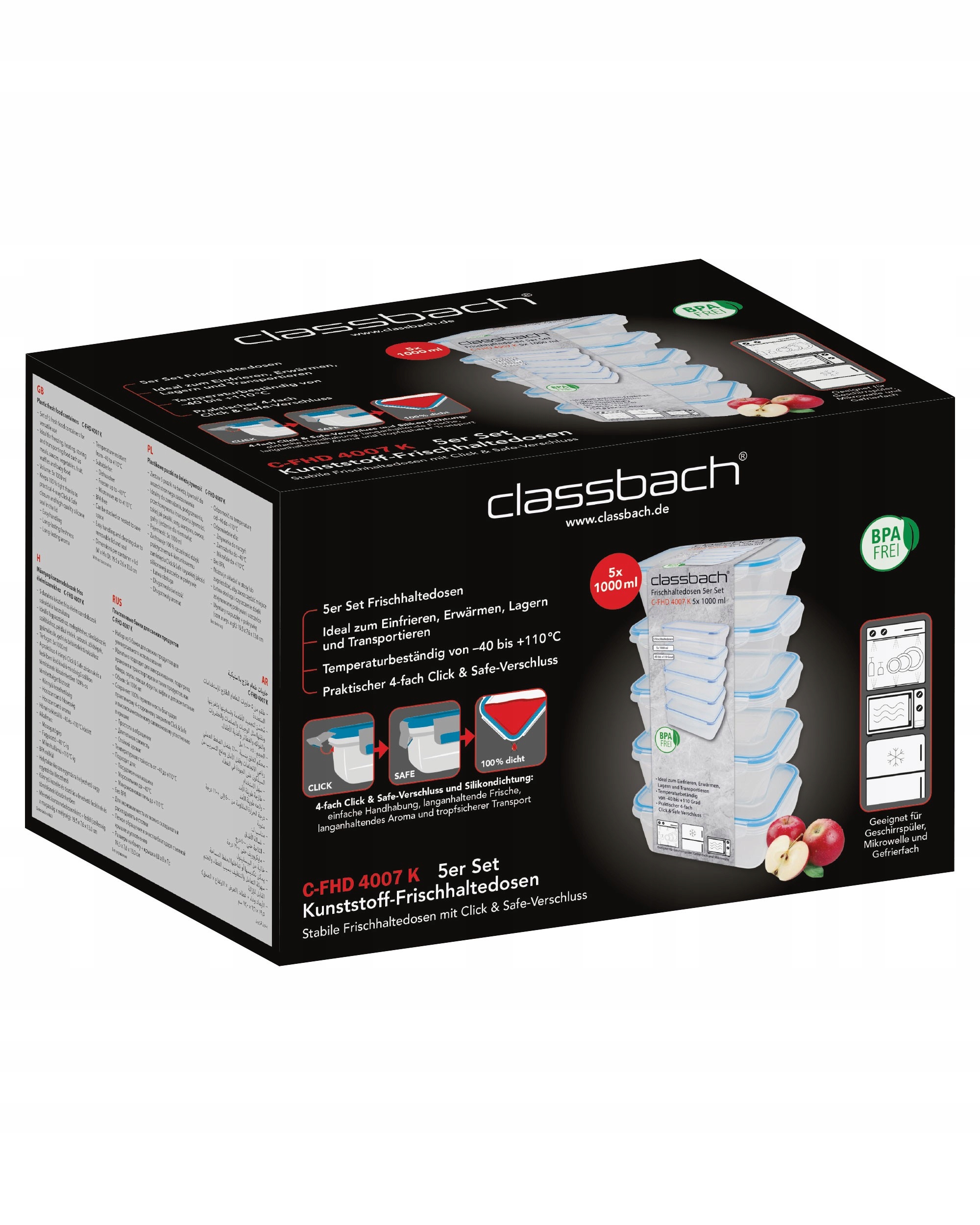 Classbach C-FHD набір, що складається з 5 прозорих контейнерів з герметичною закупоркою ємністю 1000 мл кожен. Вони призначені для зберігання продуктів, як інгредієнтів, так і цілих страв. Контейнери також є чудовим рішенням, якщо ви хочете брати улюблену страву з собою на роботу. Вони маютьгерметичні замки Click & Safe, завдяки яким їжа не висипатиметься та не розливатиметься, що може негативно вплинути на безпосереднє оточення контейнера чи свіжість продуктів, що зберігаються.