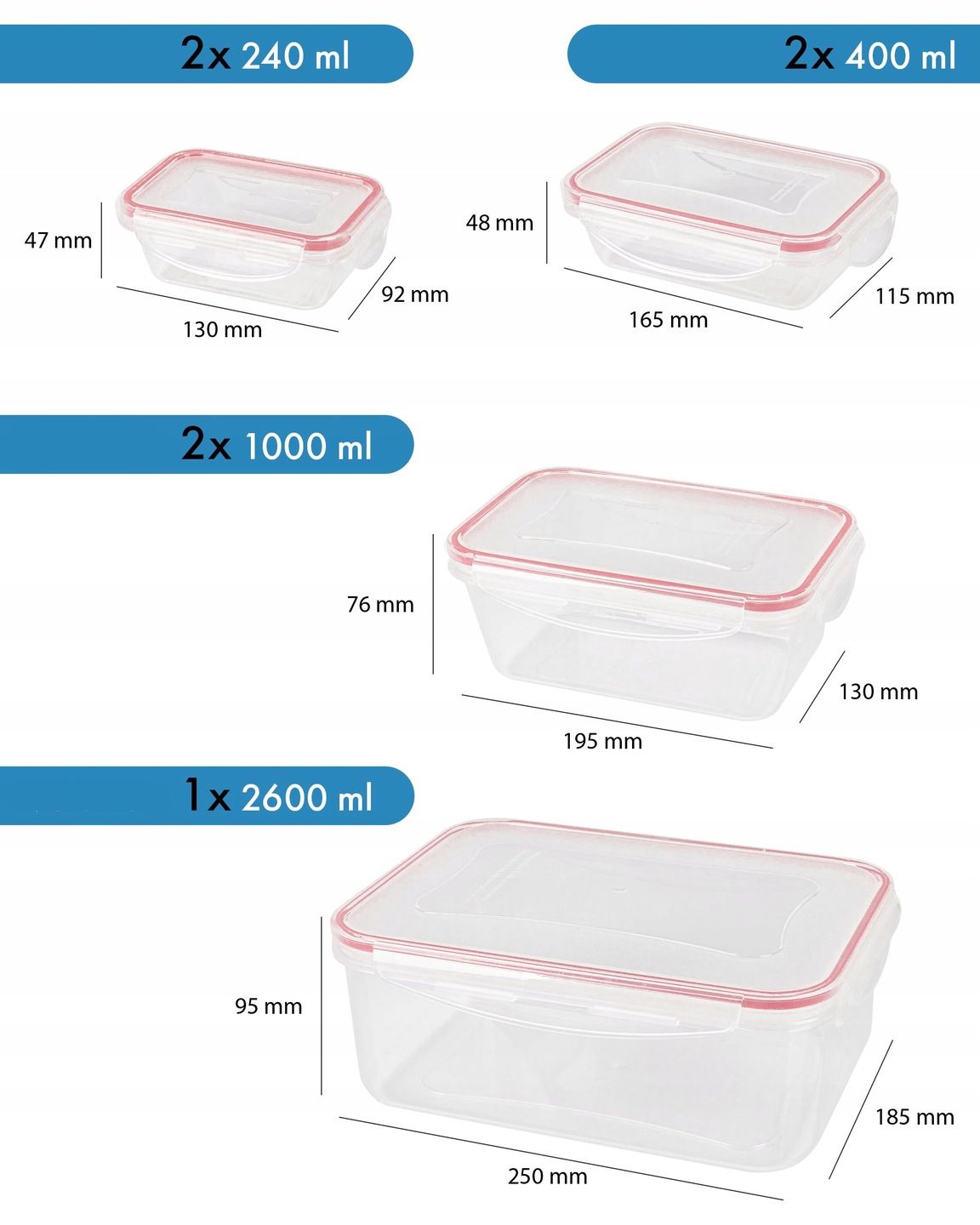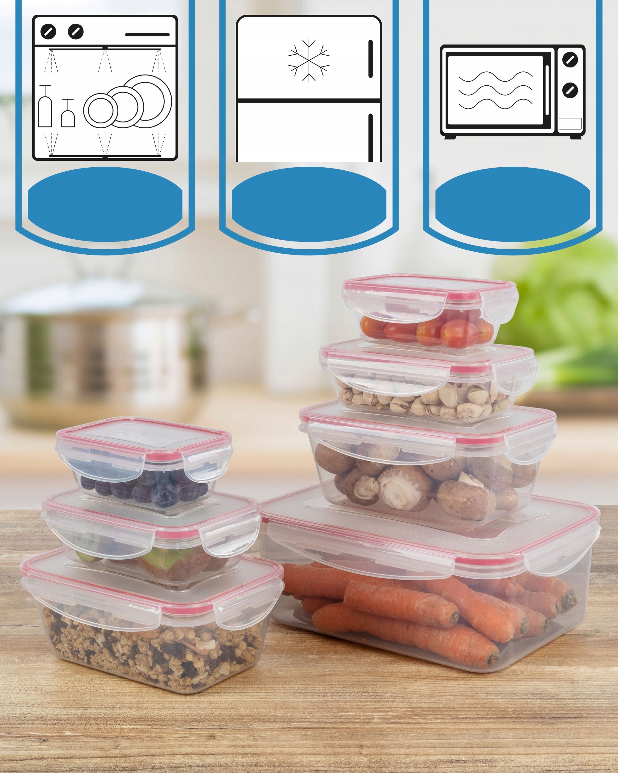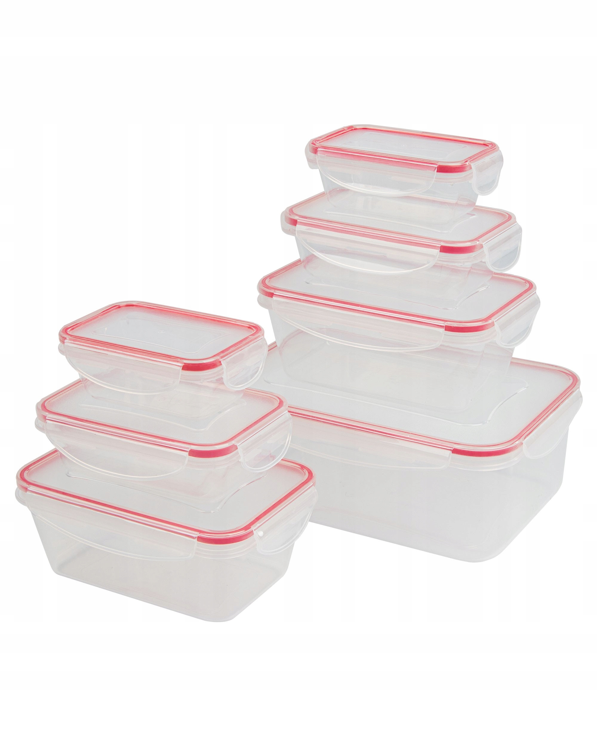 Набір прозорих контейнерів з герметичним закриттям для зберігання їжі. Набір був виготовлений повністю з високоякісного пластику, стійкого до температури в діапазоні від -40 до +110 ° С, щоб ми могли зберігати їх у морозилці, а також нагрівати в них посуд за допомогою мікрохвильової печі.