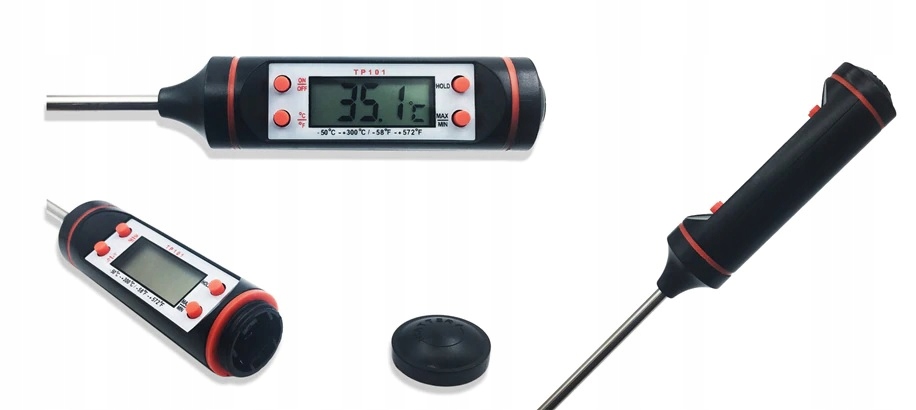 Термометр у пластичному випадку, який захищає термометр від механічного пошкодження та від крана скелета. Ідеально підходить для вимірювання температури посуду, тортів, рідин, м'яса тощо.