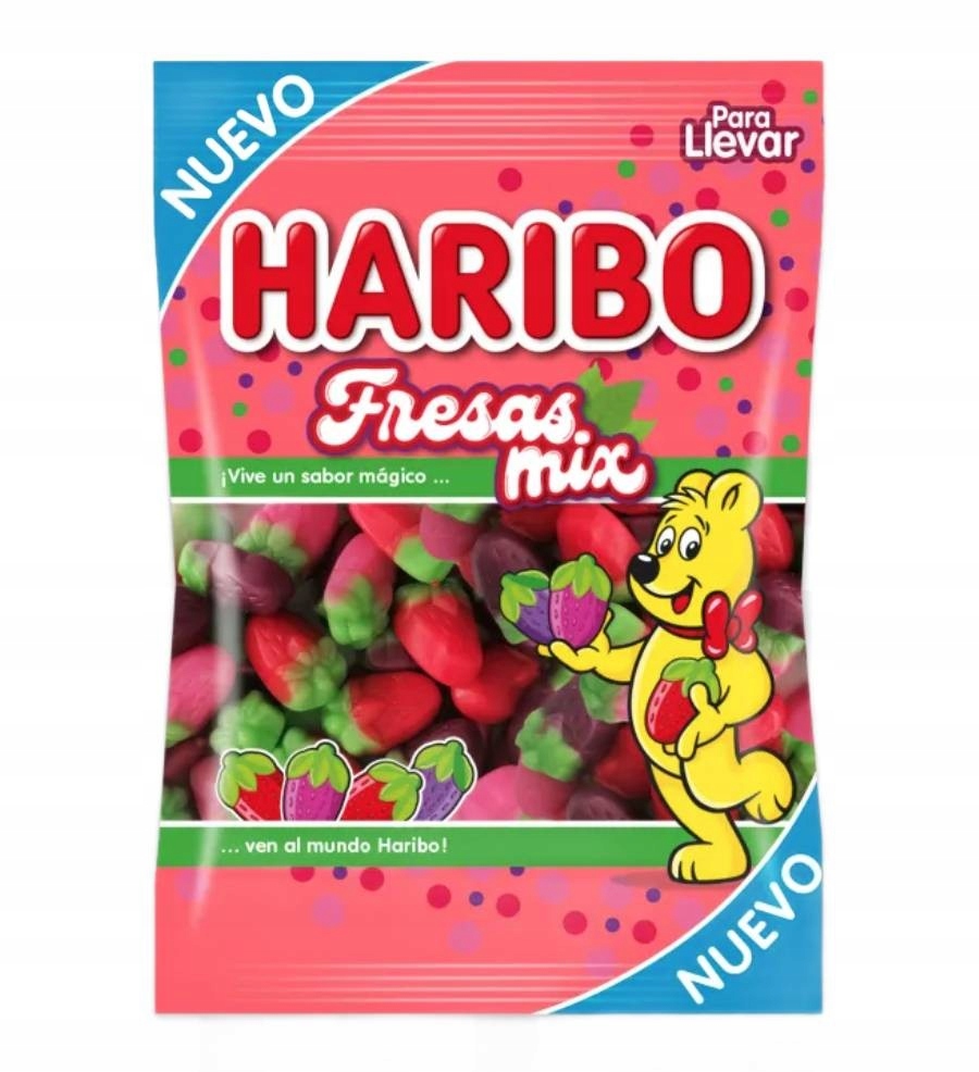 Haribo Fresas Mix — це мега полуничний набір желе у формі цих фруктів, який пропонує три різні смаки: класичну полуницю, кислу полуницю та желе зі смаком полуниці. Ідеально підходить для того, щоб взяти з собою в дорогу або приємно відпочити. Желе Haribo вже багато років є символом найвищої якості, а Fresas Mix поєднує в одному пакетику соковитість і кисло-солодкий відтінок!