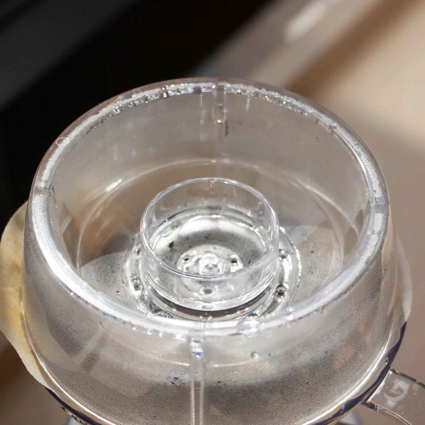 Ковпачок виготовлено з високоякісного полімеру, безпечного для контакту з їжею. Має отвори різного розміру - більшого діаметра в центральній частині і меншого зовні. Більші отвори забезпечують швидкий потік води, що рекомендується для попереднього настоювання, тоді як зовнішні отвори ллють воду повільно. Якщо налити забагато води в зовнішні отвори, вона переллється у внутрішню частину, що є надійним захистом від проливання. Завдяки цьому кріпленню вам не потрібен глечик з профільованим горлом, оскільки кріплення забезпечує точність розливу. Тому це також чудове рішення для початківців кавоманів, які не мають в своєму оснащенні спеціального чайника.