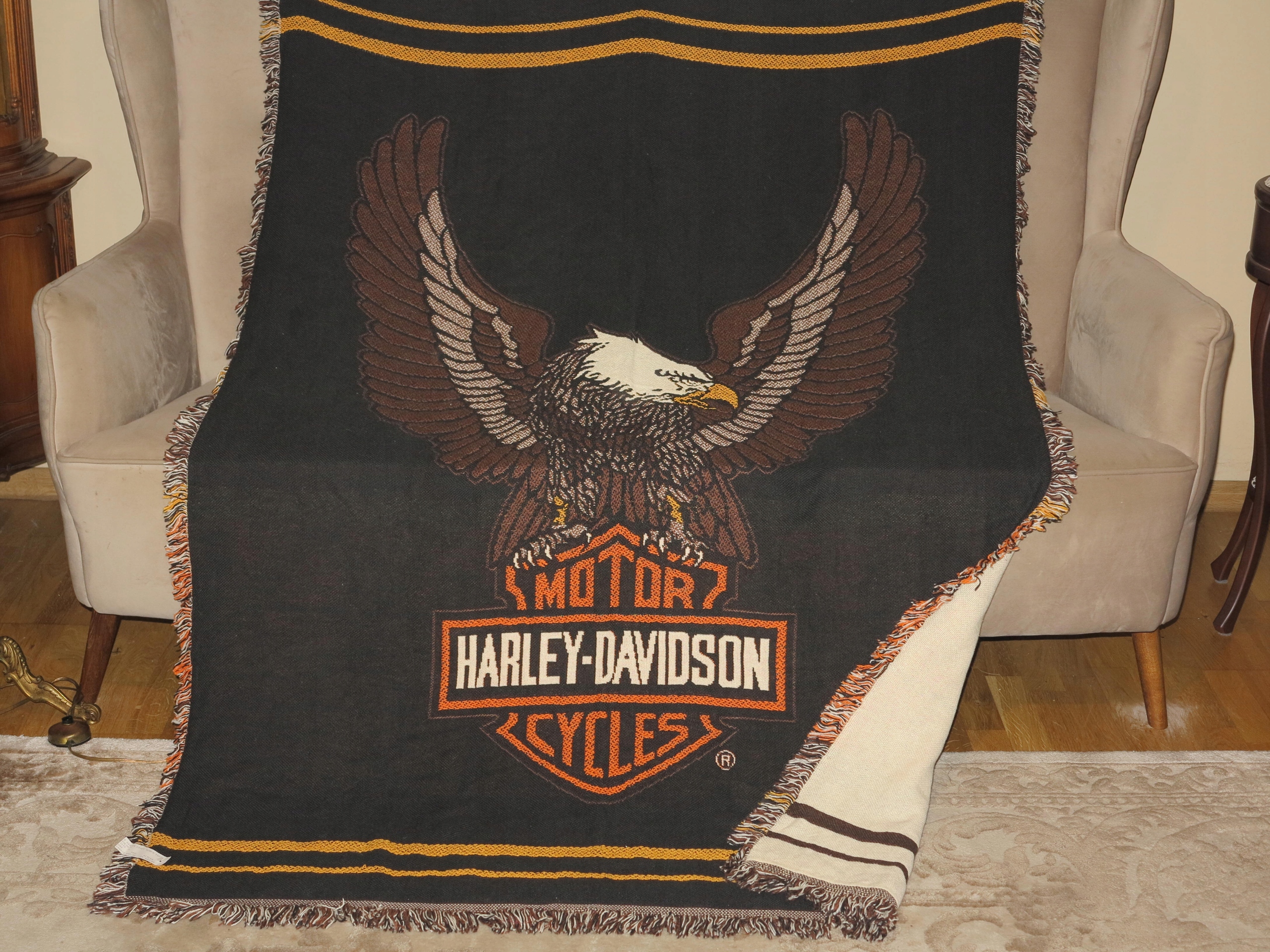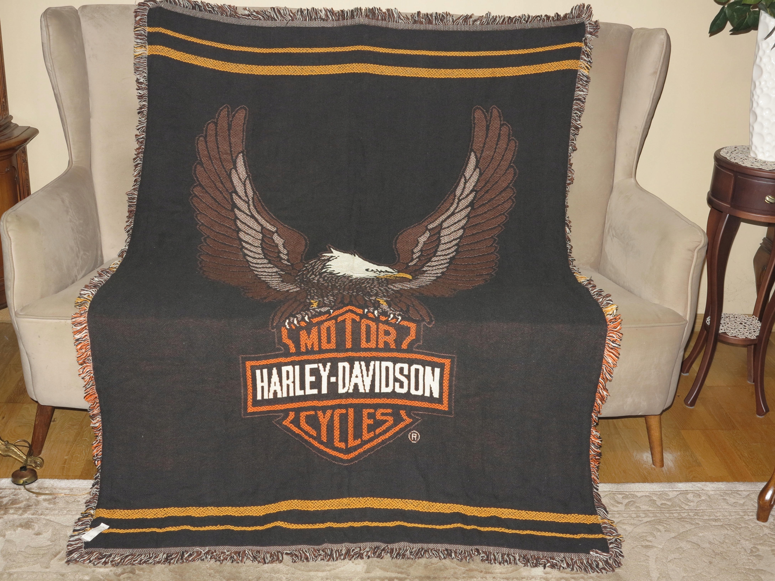 Предмет аукціону оригінальна, унікальна, бавовняна скатертина, настінний килим - Harley-Davidson. Б/у, у відмінному стані, хорошій якості - оригінальна бирка збережена. Рекомендую, унікальна і красива річ.