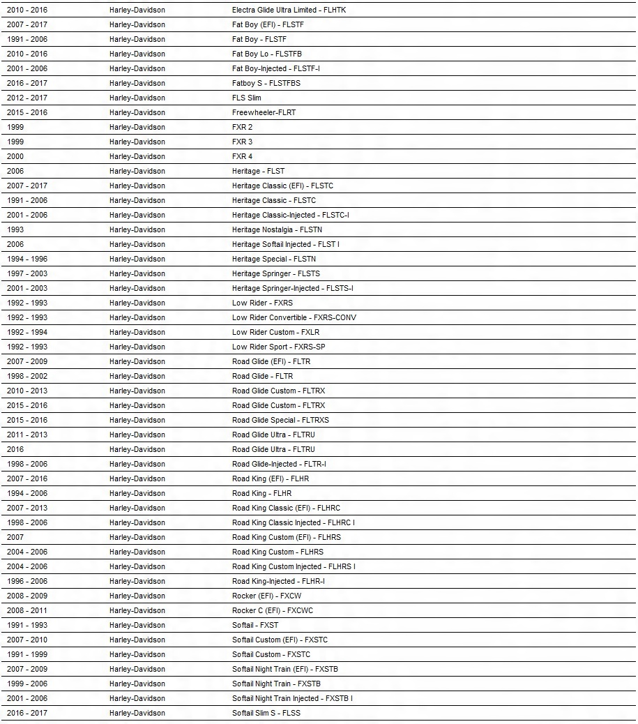 HERITAGE FLST/C/N/S, LOW RIDER FXRS, LOW RIDER, LOW RIDER FXRS, LOW RIDER Convertible FXRS-Conv, Low Rider Custom FXLR, Low Rider Sport Fxrs-Sp FxStb, h2> Softail Slim S FLSS, Softail Springer FXSSTS/B, SOFTAIL Springer Classic FlStc, Softail Standard FXST, SPORT GLIDE FXRT, H2> Street Glide FLHX/S, Street Glide Trike Flhxxx, Super Glide Fxr, Super Glid FXD35, Superlow XL 1200T, Tour Glide Fltc/ U,