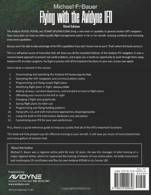 Це оновлена версія популярної книги Michael F Bauer 'Screario Training на Avidyne IFD550, IFD540 та IFD440 GPS/NAV/COMS, що додає уроки на нових функціях IFOS10.3, включаючи VNAV та візуальний підхід. 4 Він використовує підхід, заснований на школі, щоб представити проблеми реального світу, і це дає вам практичну можливість працювати над ними за допомогою програм Simulator Avidyne. Ви будете практикуватись із усіма важливими функціями самостійно, з власною швидкістю.