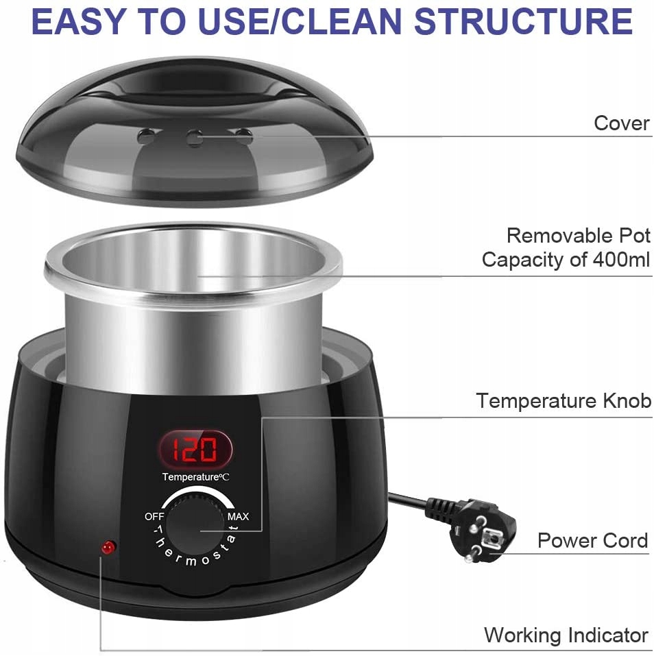 - Цей нагрівач воску підходить для плавлення більшості вощених форм і допомагає видалити волосся з усіх областей, таких як пахви, зона бікіні, борода тощо. Віск видаляє будь-які тип волосся, від неслухняного до найніжнішого пушку, залишаючи шкіру м’якою та блискучою.