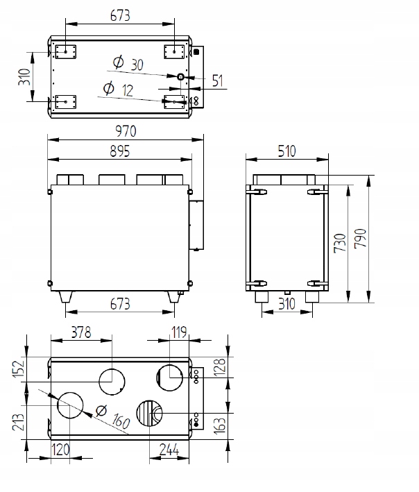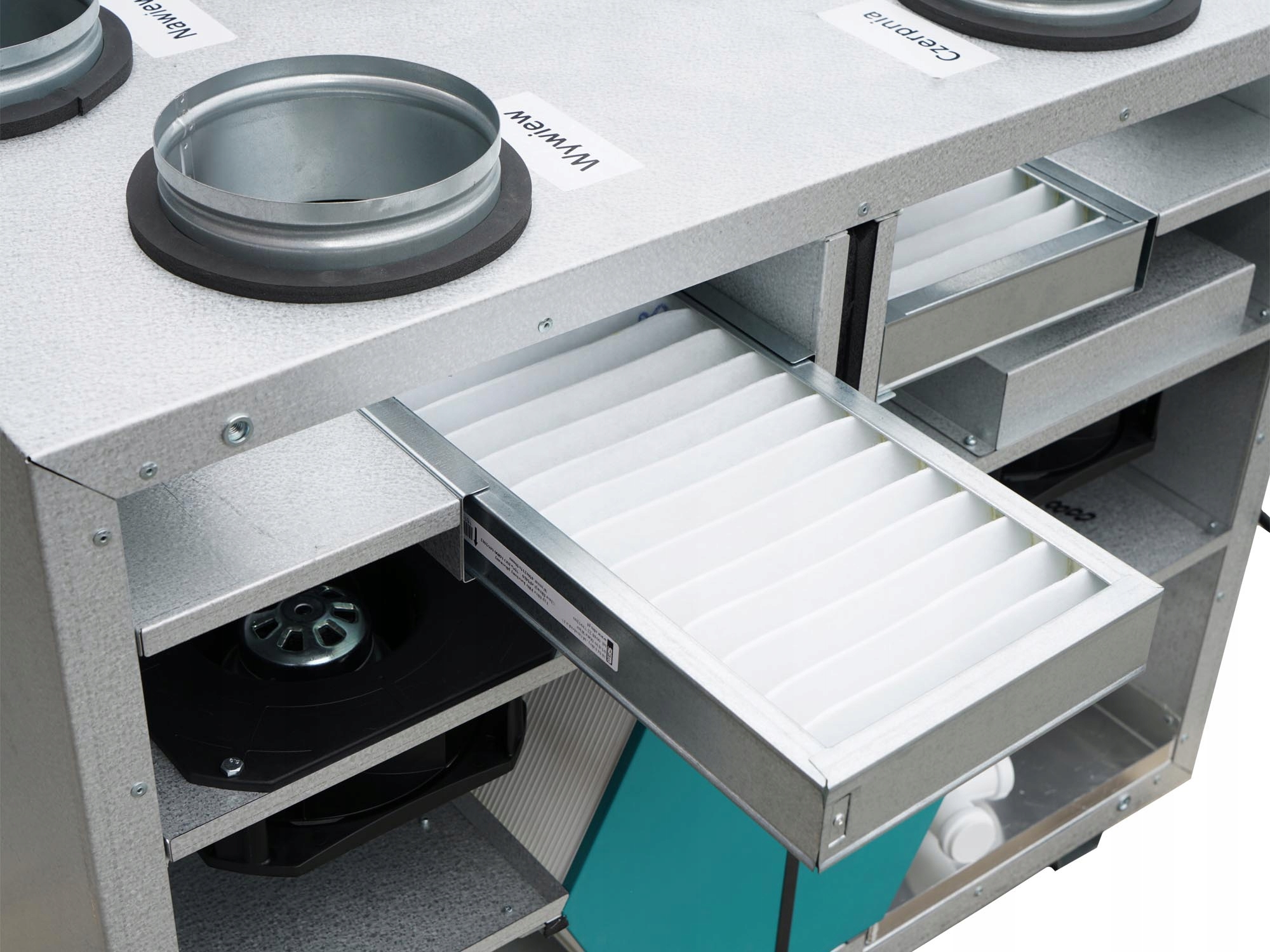 У внутрішній частині панелі управління існує високоякісний теплообмінник (відновлення тепла до 95%). Пристрій на прийомі та виході був забезпечений фільтрами, щоб уникнути бруду всередині. З боку вихлопу також був встановлений для конденсату, а також для дренажного роз'єму було встановлено і для дренажного роз'єму.