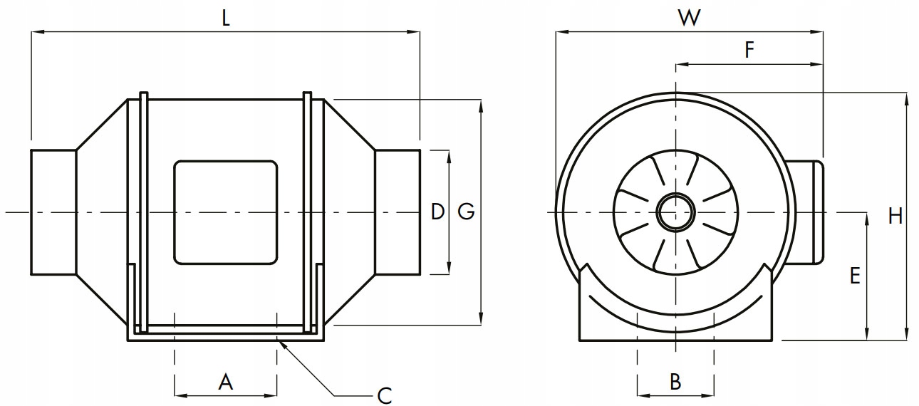 Діагональний канальний вентилятор. Його унікальна конструкція та використання сучасного двигуна з електронною комутацією (EC) дозволяють досягти високих робочих параметрів із відносно низьким рівнем шуму та дуже низьким споживанням енергії. Корпус вентилятора виготовлений з поліпропілену, а робоче колесо виготовлено з ABS-пластику. Спеціальні роз'єми полегшують монтаж і демонтаж пристрою та його обслуговування. Пристрій можна встановити як у горизонтальному, так і у вертикальному положеннях.