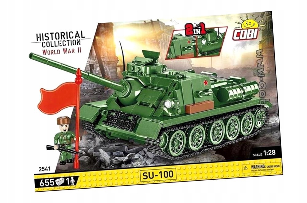 Модель САУ СУ-100 сконструйована повністю з будівельних блоків COBI. Використання аж 655 цеглинок дозволило точно відтворити цей транспортний засіб. У набір не входять наклейки. Блоки покриті якісними принтами, які не стираються навіть при інтенсивній експлуатації. Модель оснащена ефективною гусеничною тягою, рухомою гарматою і відкриваються люками. Під сервісною кришкою є привабливий на вигляд макет двигуна. У комплекті блоки з радянським і польським маркуванням на вибір. Доповнює все це фігурка солдата з гвинтівкою Мосіна, кашкетом-ушанкою та червоним прапором. Чіткі інструкції містять список блоків і статистику, які ви можете використовувати в безкоштовній грі COBI Historical Battle Game.