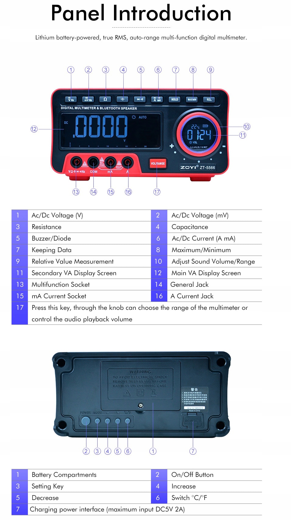 Цифровий мультиметр із функцією вимірювання True RMS (RMS), що підтверджує його високу точність. Лічильник оснащений годинником, будильником і функцією Bluetooth-динаміка для відтворення музики, а також окремим дисплеєм температури. Завдяки підсвічуванню екрана та функції збереження даних користувачі можуть легко працювати в темряві. Він може бути використаний для вимірювання, серед іншого: Змінна/постійна напруга та струм, опір, ємність, частота, робочий цикл.