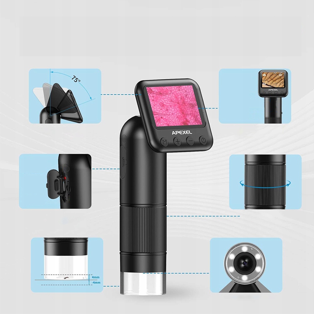 - Пристрій легко вписується в кишеню і оснащений нахиленим екраном 75 градусів, літій-іонним акумулятором (4-5 годин безперервної роботи) та системою легкого потемніння. Електронний мікроскоп.