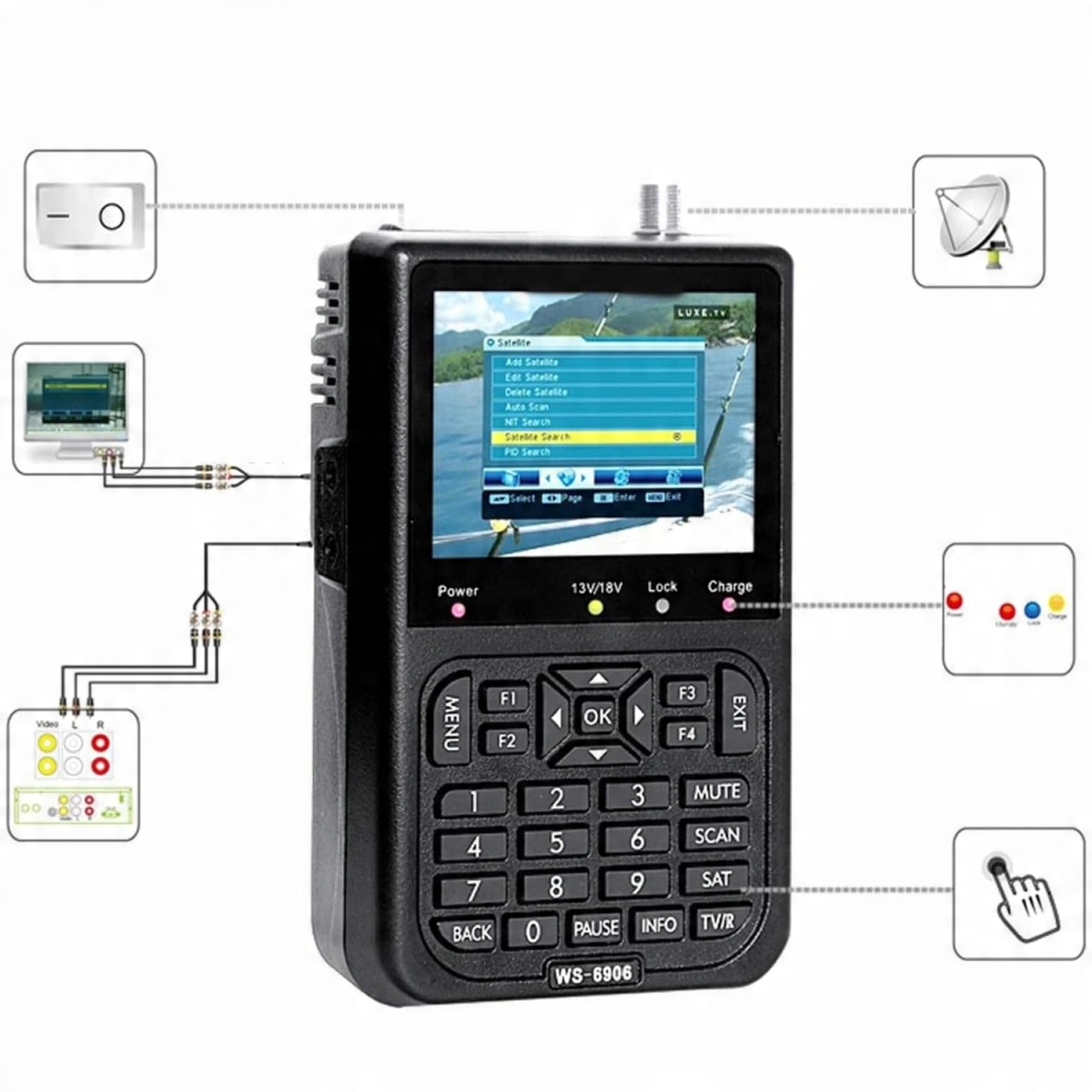 satlink ws6906 може бути підключений до телевізора як стандартний приймач. Пристрій також має вхід AV. До цього входу інші камери або моніторингові камери можуть бути підключені до AV.