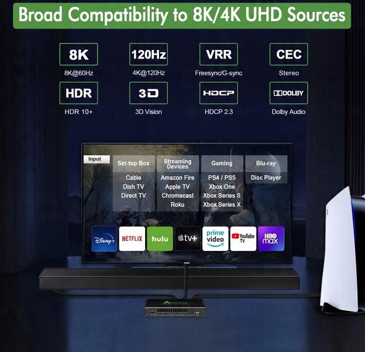 - 【Широка сумісність】 – двонаправлений розгалужувач 8K HDMI ідеально працює з телевізорами UHD, пристроями HDMI 2.1 HDCP 2.2/HDCP 2.3, ігровими консолями, такими як Xbox, PS4, PS5, Nintendo Switch; Стримери, такі як Apple TV, Fire Stick, Roku.