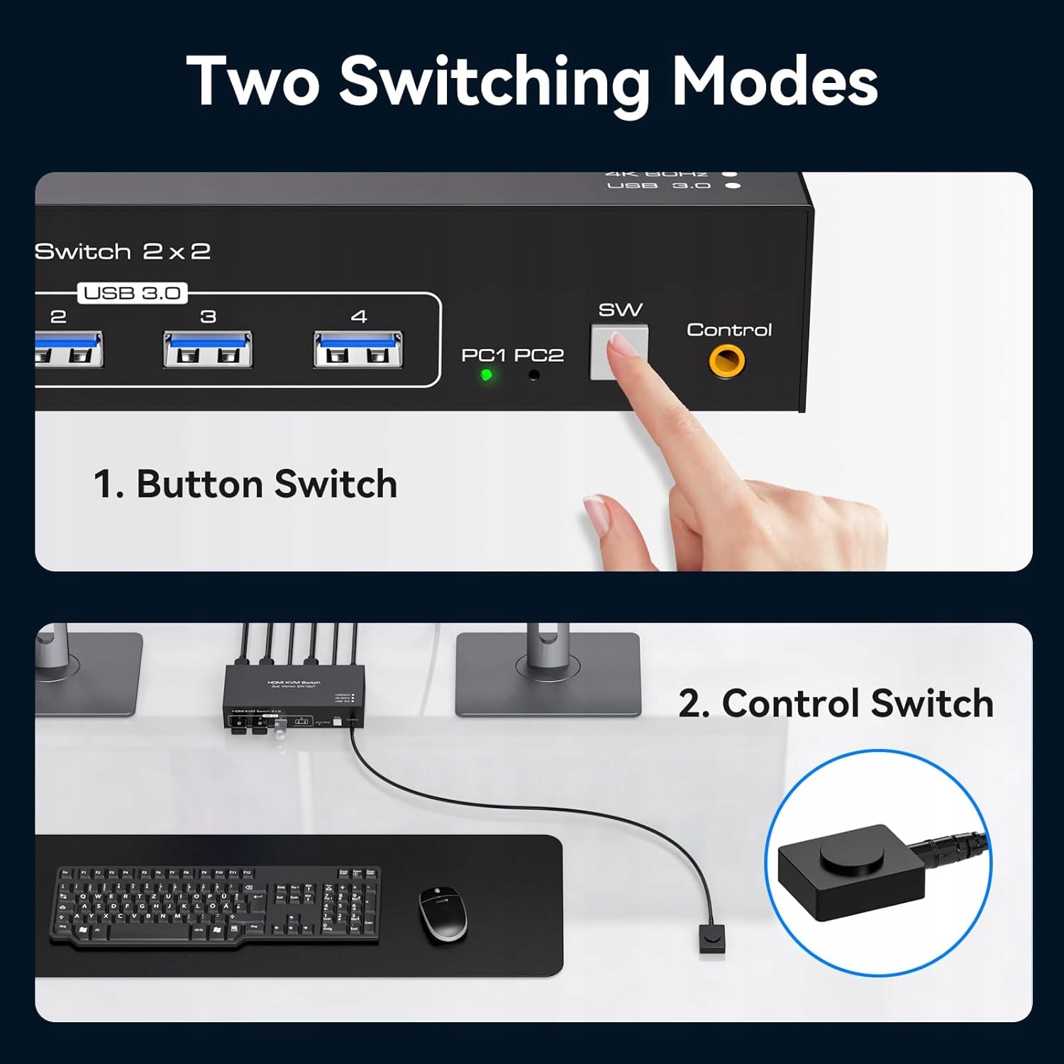 Вихідний перемикач KVM 2 в 2 має два способи перемикання: перемикачі KVM HDMI підтримують кнопки на панелі та зовнішній кабельний контролер. За допомогою дротової кнопки розширення ви можете розташувати перемикач KVM за межами робочої зони, зробивши ваш стіл чистішим і охайнішим. Ви також можете просто натиснути кнопку на панелі поруч з елементом керування для перемикання в один клік. Він простий, швидкий і легкий у використанні, тому ви заощадите час, який можете витратити на інші дії. ПРИМІТКА. Комбінації клавіш (гарячі клавіші) не підтримуються.