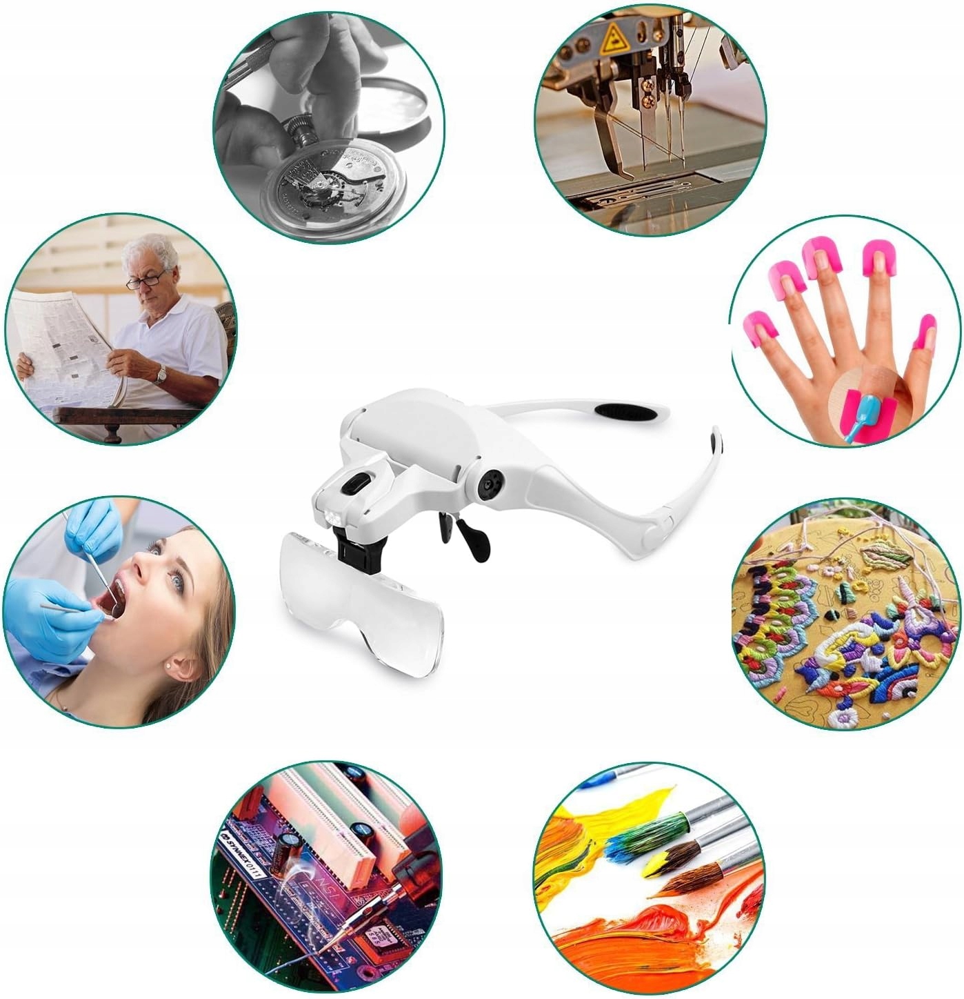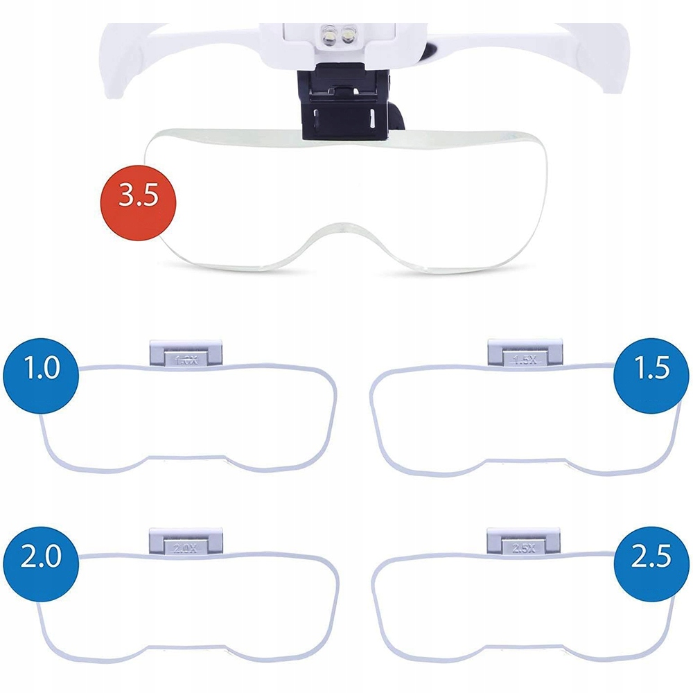 Збільшувальні окуляри зі світлодіодним підсвічуванням, пов’язка на голову, лупа, USB-зарядка, із 5 змінними лінзами 1.0X, 1.5X, 2.0X, 2.5X, 3.5X