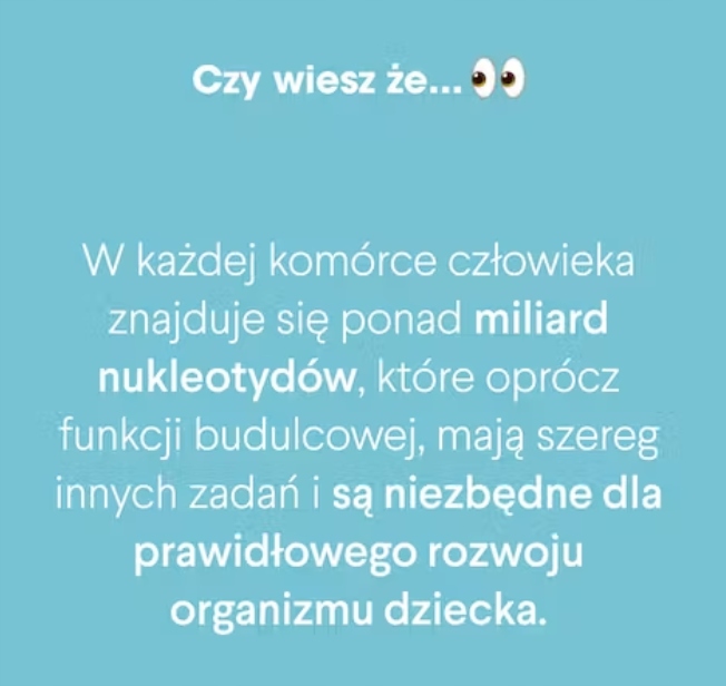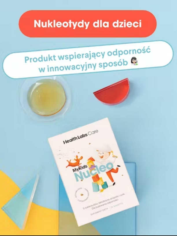 Дієтична добавка MyKids Nucleo, як одна з небагатьох дієтичних добавок для дітей на польському ринку, містить 5 основних нуклеотидів у формі легкорозчинного порошку, які є основними будівельними блоками ДНК і Нуклеїнові кислоти РНК.