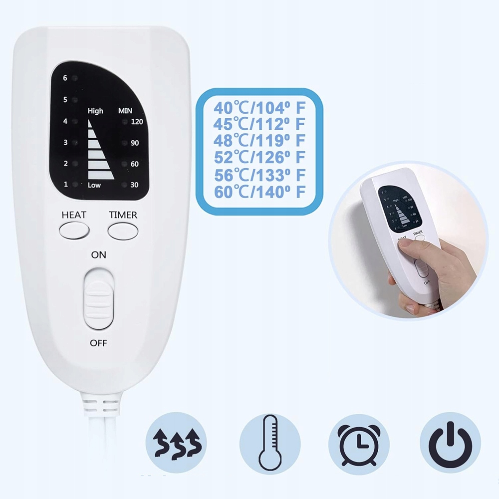 - Електрична ковдра з функціями автоматичного вимкнення та захисту від перегріву, з використанням подвійних ліній захисту від перегріву PTC і NTC і 4 налаштувань таймера автоматичного вимкнення, щоб уникнути перегріву, забезпечити безпеку та заощадити енергії.