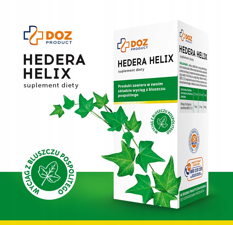 DOZ Продукт Hedera Helix рідина 120 мл – дієтична добавка у формі сиропу, що містить екстракт листя плюща звичайного. Ця рослина відома своїм позитивним впливом на дихальні шляхи - сприяє розрідженню виділень, полегшує відхаркування і заспокоює кашель. Препарат рекомендований як дорослим, так і дітям у період простудних та інфекційних захворювань.
