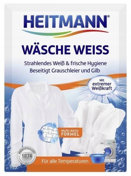 Для всіх тканин, крім вовни та шовку. Можна використовувати як підсилювач миючого засобу та для попередньої обробки. Нехай ваша білизна знову засяє надзвичайною білизною. HEITMANN Laundry White видаляє сірий туман, плями та пожовтіння в практичному пакеті. Крім того, мультиактивний кисень, що міститься в ньому, забезпечує чистоту аж до волокон і тривалу свіжість. Пральна білизна HEITMANN підходить для будь-яких температур і миючих засобів. Для одного застосування.