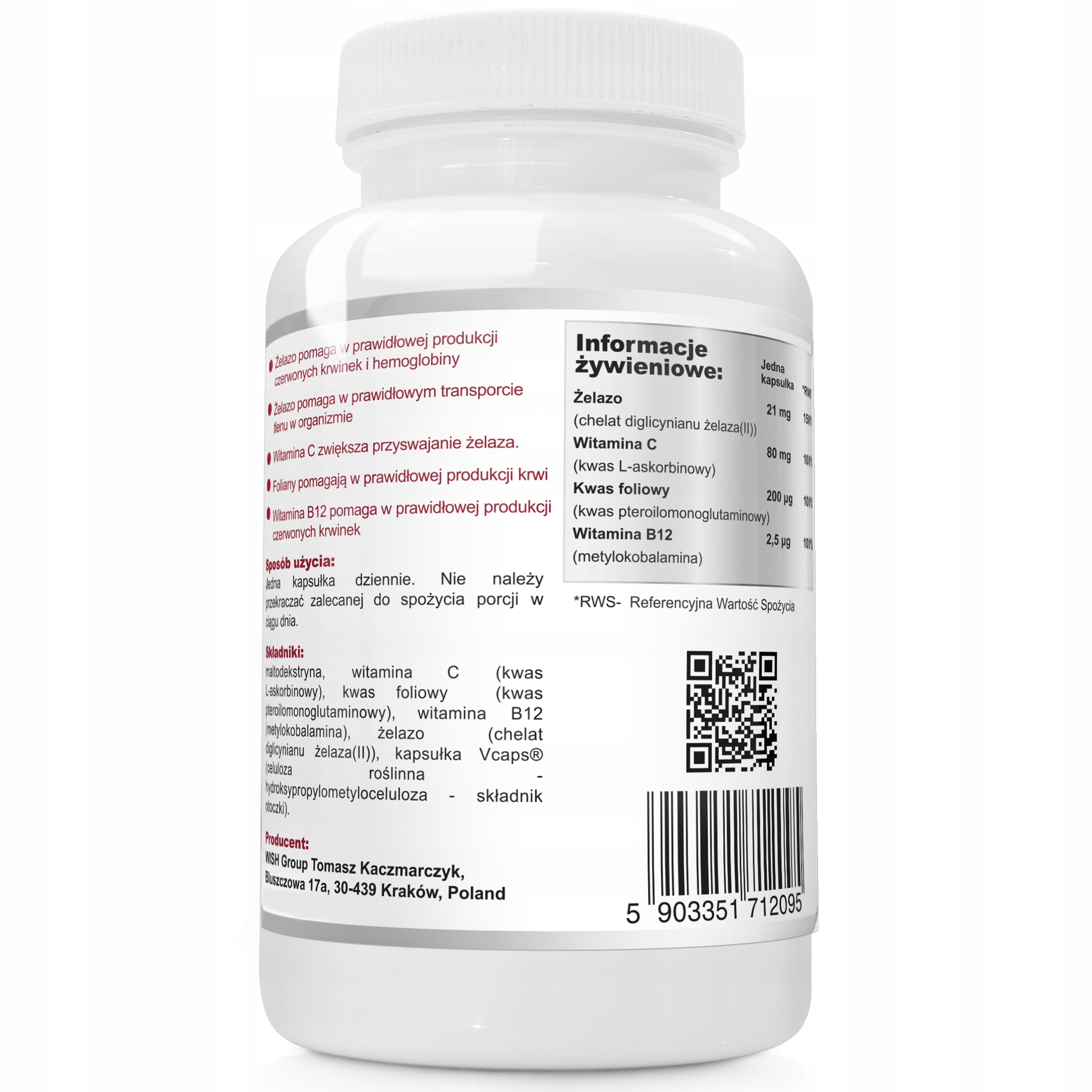 СКЛАД: мальтодекстрин, вітамін С (L-аскорбінова кислота), фолієва кислота (птероілмоноглутамінова кислота), вітамін B12 ( метилкобаламін), залізо (залізо(II) бісгліцинат хелат), рослинна капсула Vcaps® (гідроксипропілметилцелюлоза - компонент оболонки)