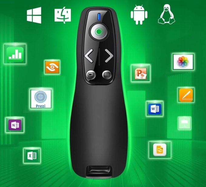 - Бездротовий презентатор : Завдяки бездротовій технології 2,4 ГГц ви можете вільно пересуватися по кімнаті та мати радіус дії до 15 м. Ви можете взаємодіяти з аудиторією, а також грати зі своїм котом. Зелений презентатор робить презентації легкими навіть у найтемніших класах.
