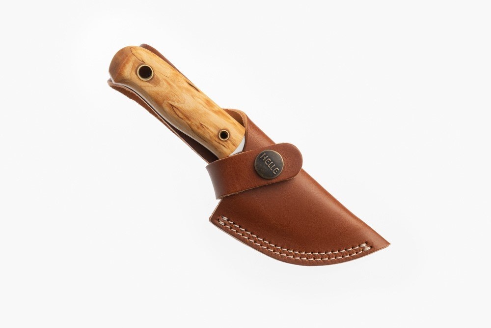 Mandra FG постачається зі світло -коричневою шкіряною піхвою з засувкою для безпечного кріплення. Білий зшивання відповідає кольору підкладки ножа.
