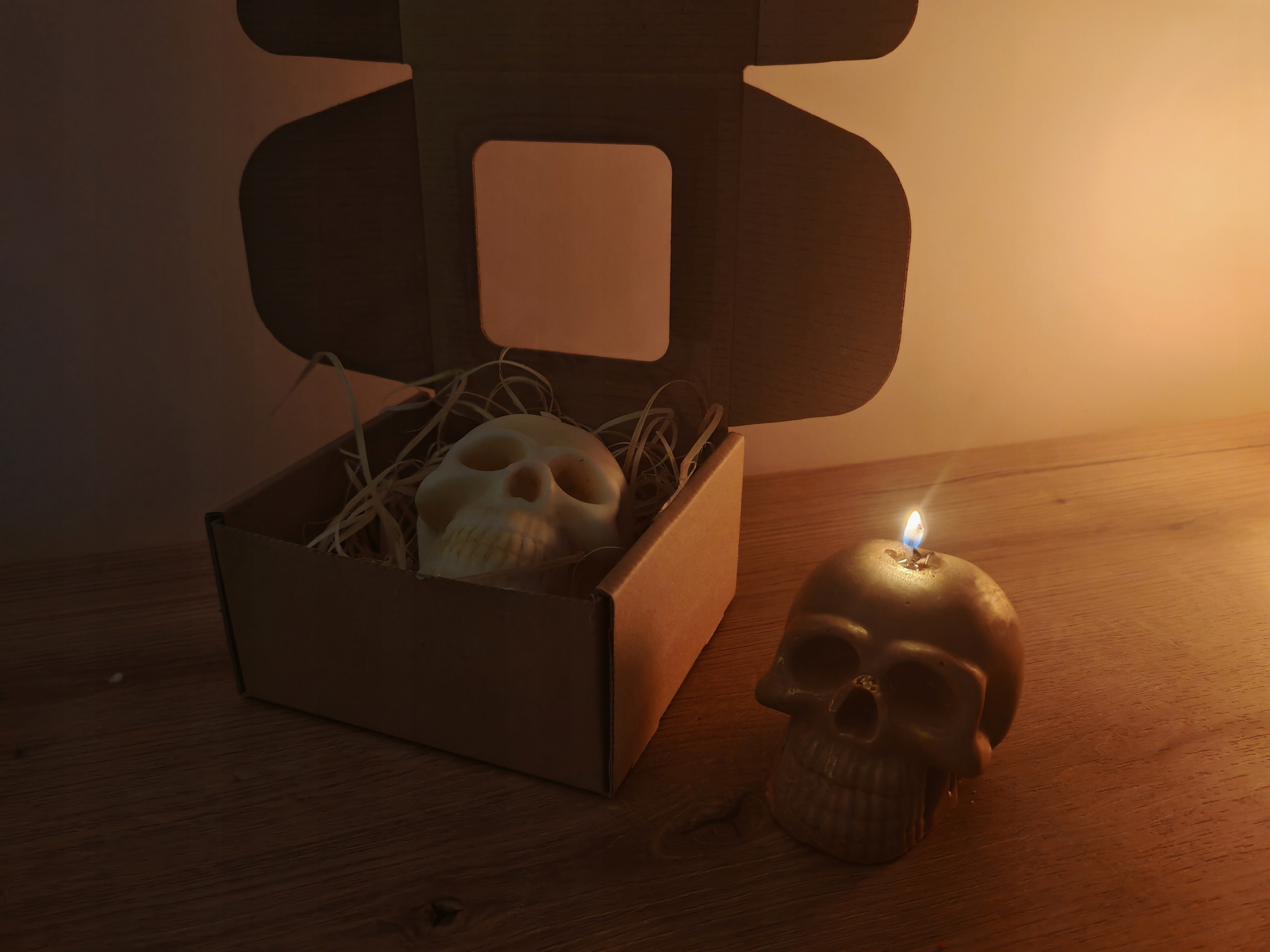 Особливості продукту: Набір з 2x свічок у формі черепа, красиво упакований. Горить без чорного диму. Свічки нешкідливі для людей і домашніх тварин, 300 г / 10 годин горіння. Тривалий, чарівний аромат.