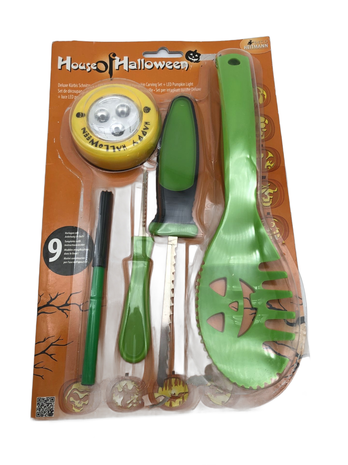 Повний набір: Цей набір включає всі гарбузові інструменти, необхідні для проектування та освітлення гарбуза на Хеллоуїні: короткий орієнтир, відра для порожнистих, два ножі у двох розмірах , ручка, дев'ять шаблонів з мотивами та світлодіодною лампою з функцією фібриляції, яка замінює свічку